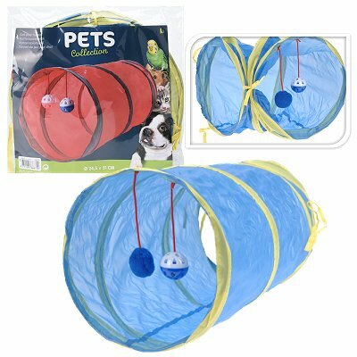 Katten speeltunnel. Met deze nylon speeltunnel kan uw kat uren spelen, het speeltje is voorzien van 2 speelballetjes voor extra plezier. Deze speelgoed tunnel wordt assorti kleur uitgeleverd in rood en/of blauw. Afmeting: ca 24,5x51 cm.
