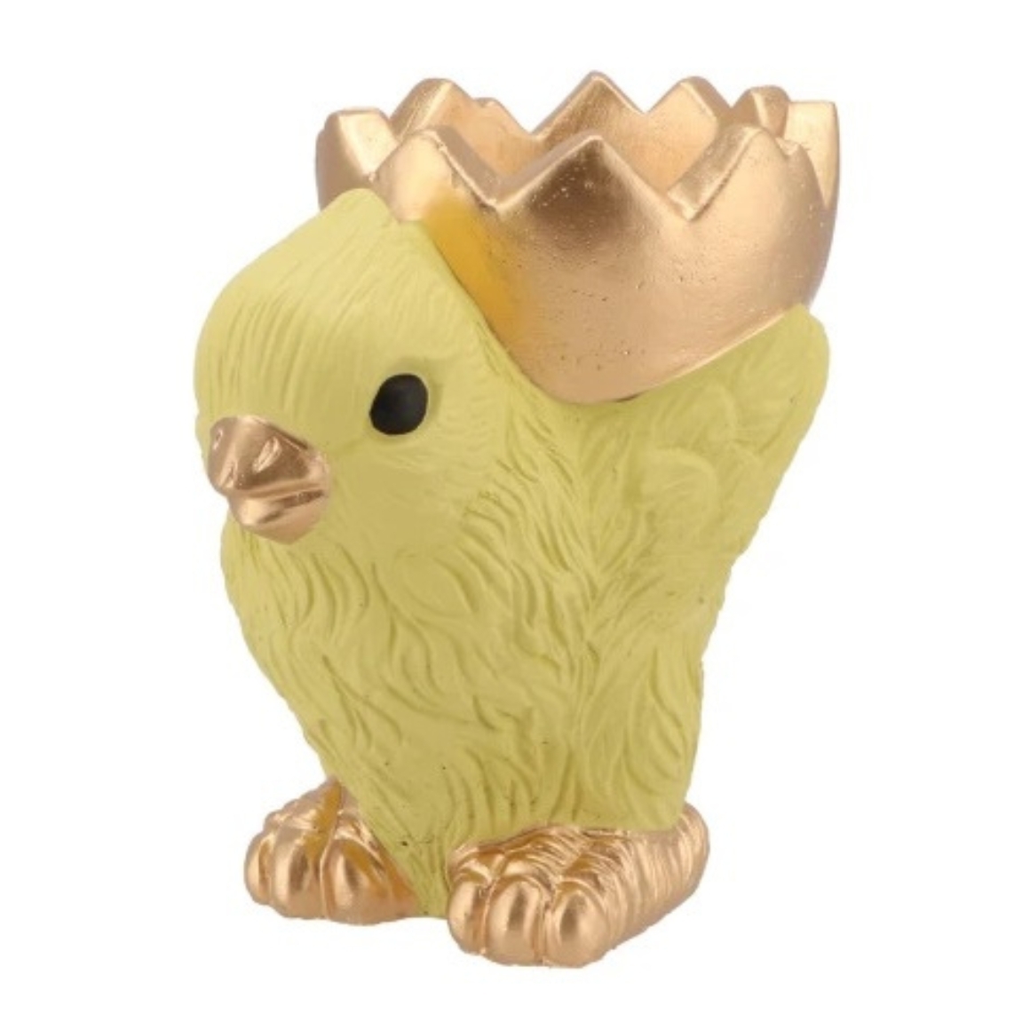 Beeld van een kuiken met op zijn rug een goudkleurige schaal in de vorm van een eierschaal.