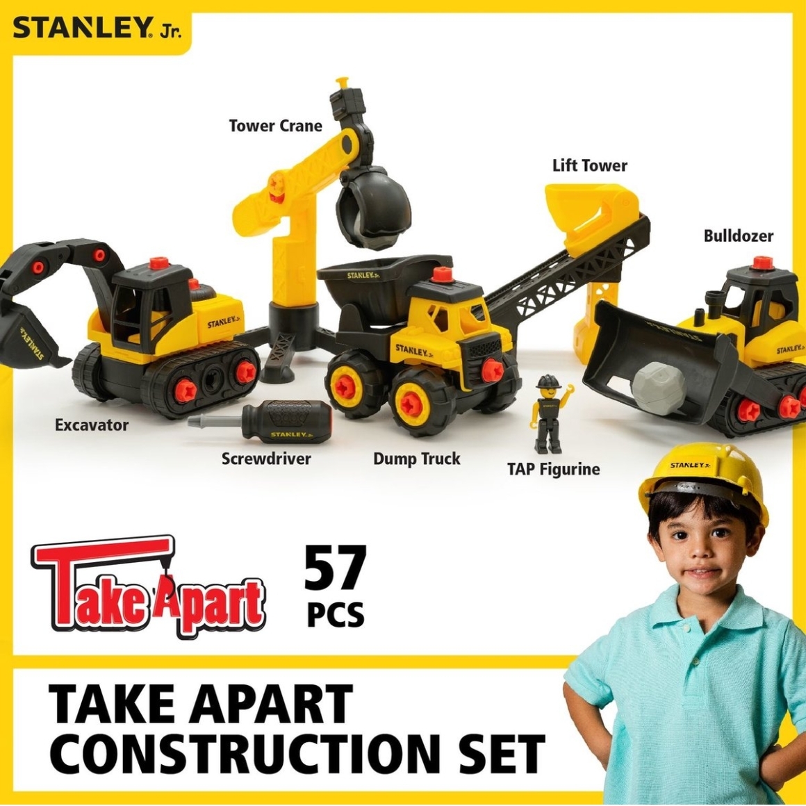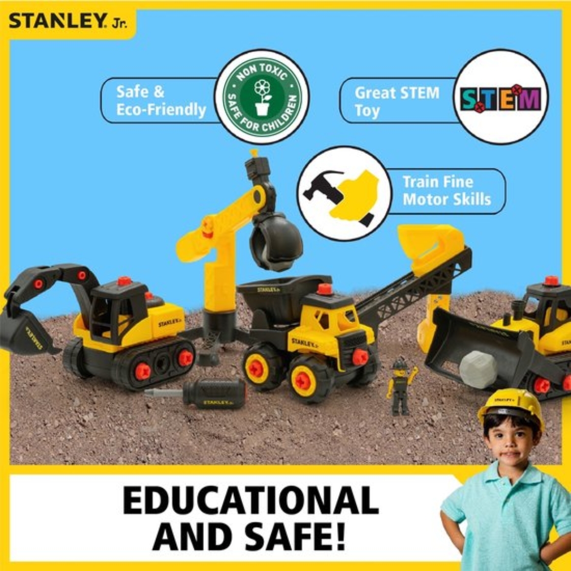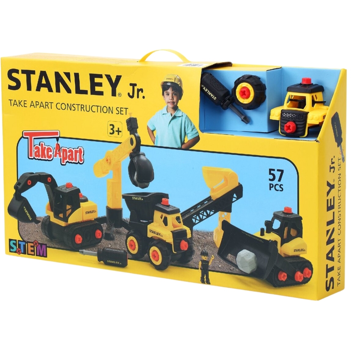 Met de 57-delige bouw speelgoed set van Stanley Jr. kunnen kinderen een bouwplaats tot leven brengen terwijl ze spelenderwijs leren. Deze set bevat 4 verschillende bouwvoertuigen - een bulldozer, kiepwagen, graafmachine en hijskraan - die kinderen samen met hun ouders kunnen bouwen. Naast de voertuigen bevat de set een schroevendraaier en een speelgoedfiguurtje om te helpen bij het bouwproces.
