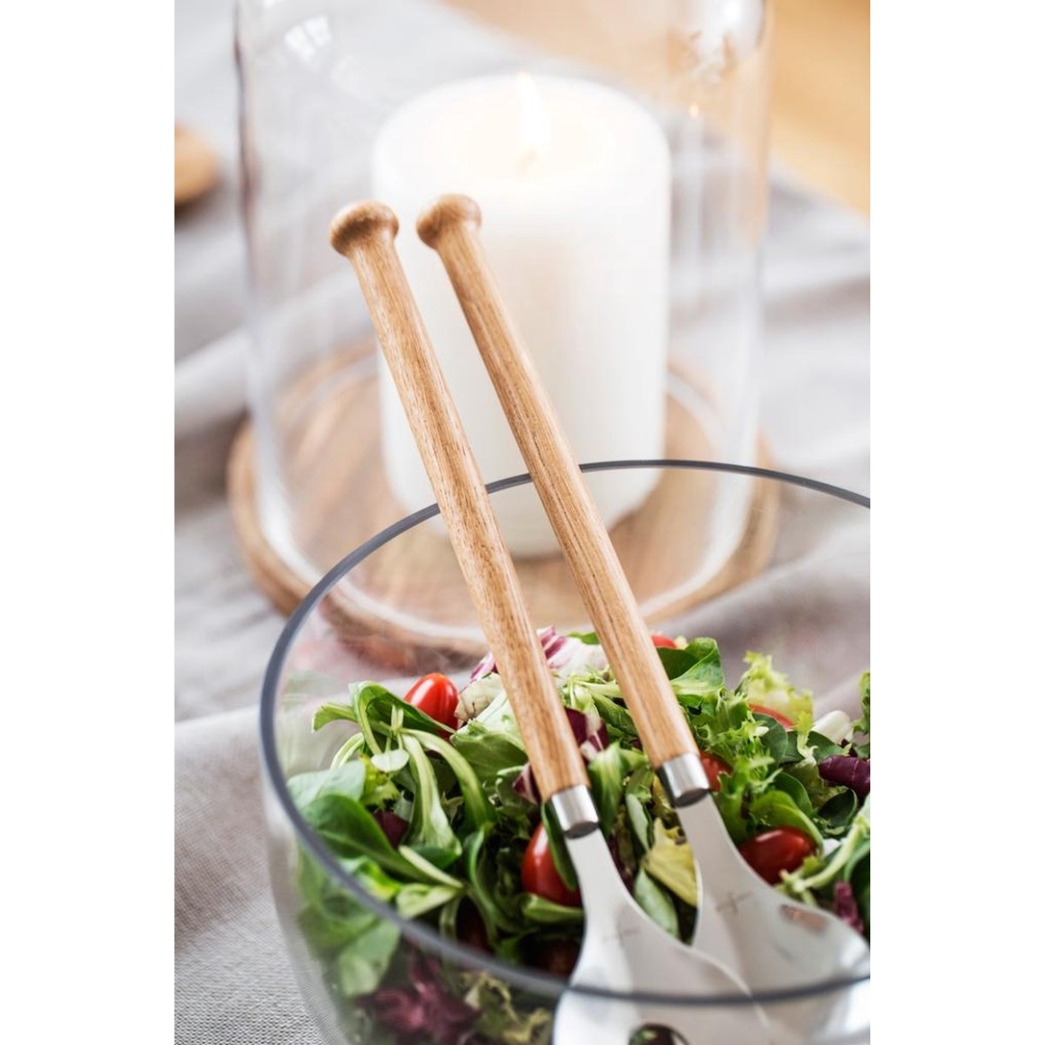 Prachtig ontworpen saladebesttek gemaakt van hoogwaardig roestvrij staal met massief eikenhouten handgrepen voor een slanke en elegante uitstraling.