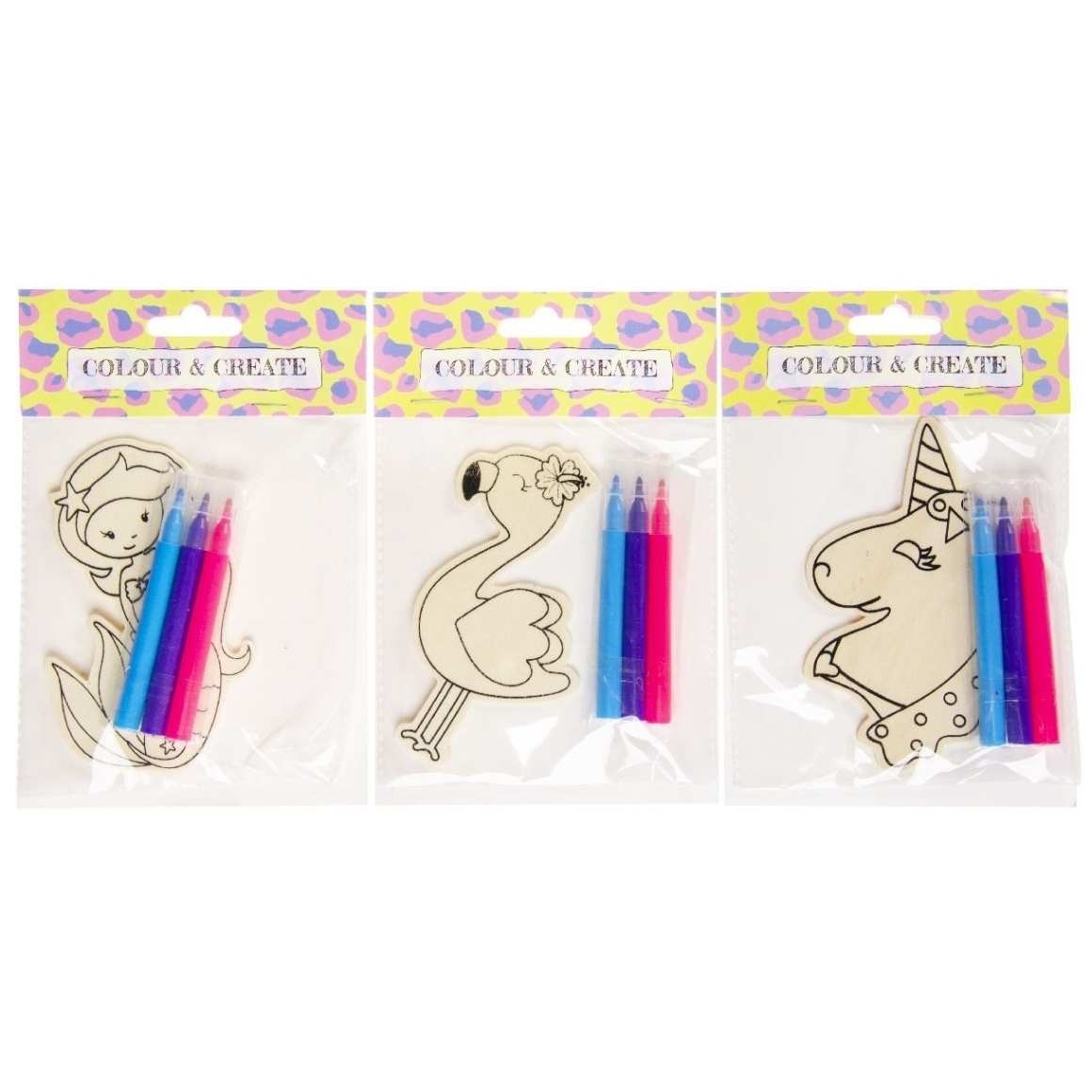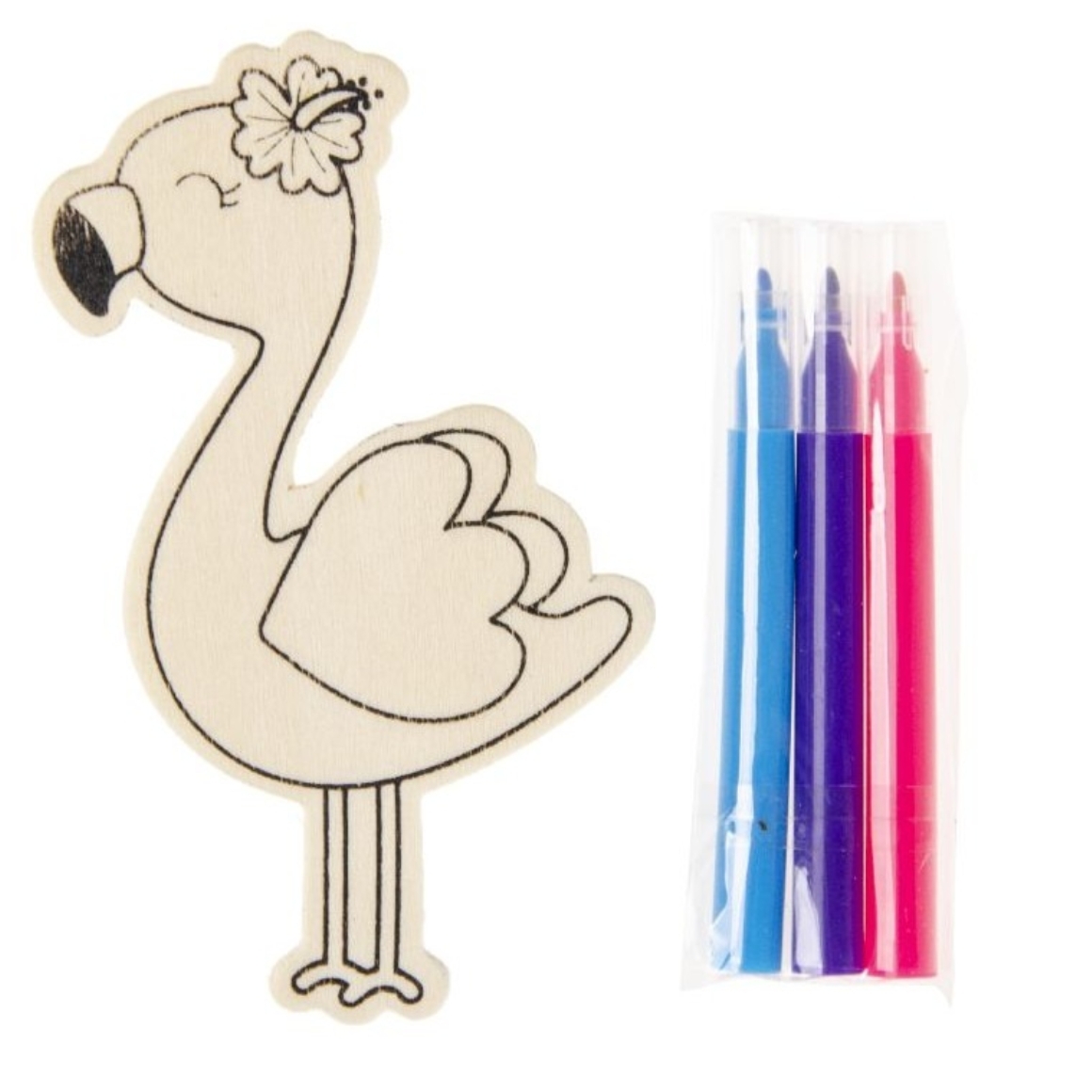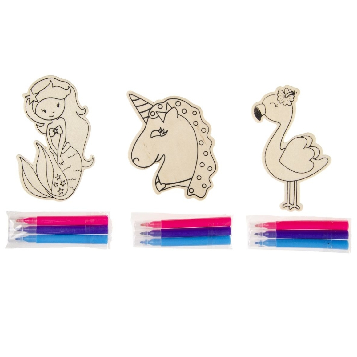 Kleur je eigen houten figuur in drie versies, een flamingo, zeemeermin of eenhoorn.