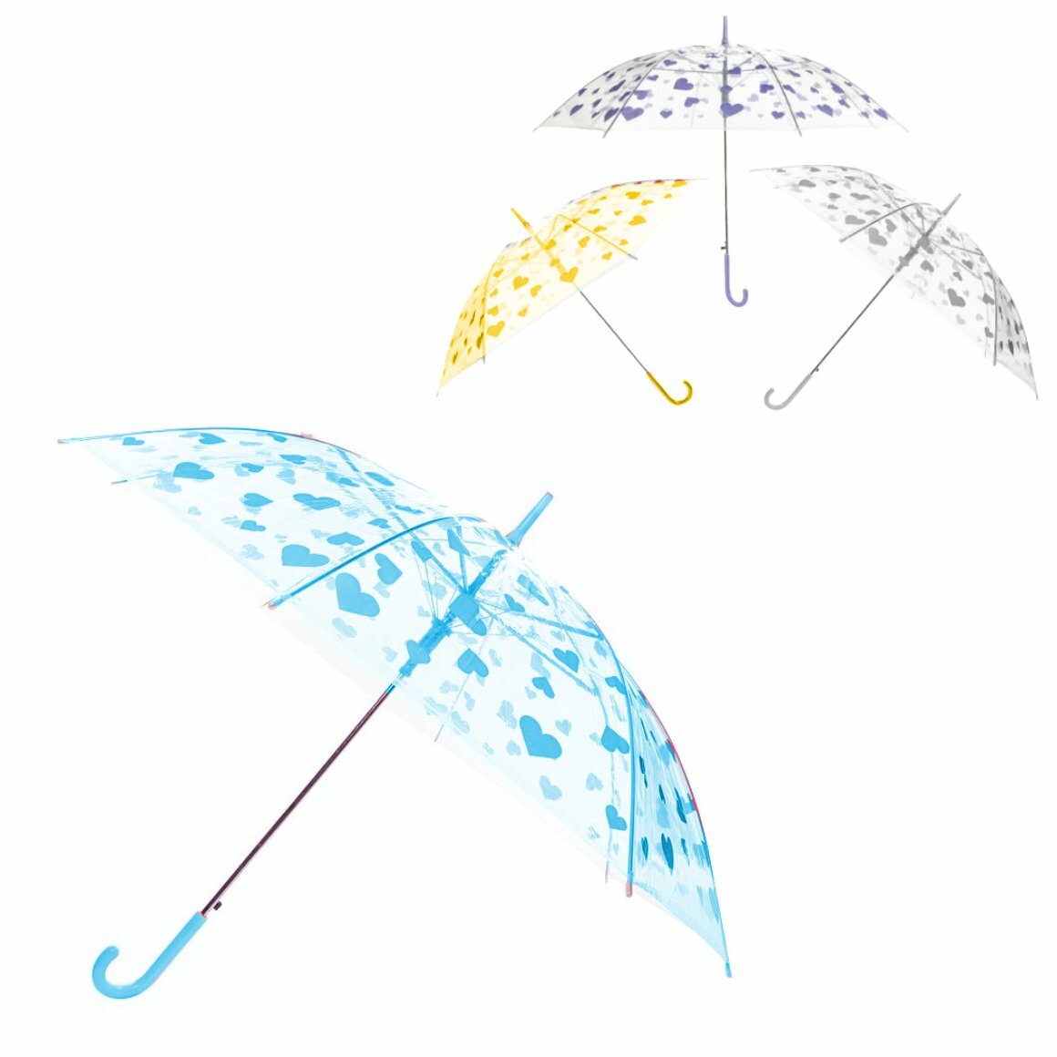 Kunststof transparante paraplu met hartjes en gekleurd handvat.