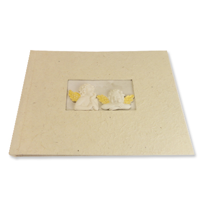 Boekgebonden fotoalbum met 3d afbeelding van 2 engelen, 40 witte zuurvrije fotobladzijden van 28x21,7 cm en pergamijn tussenvellen.