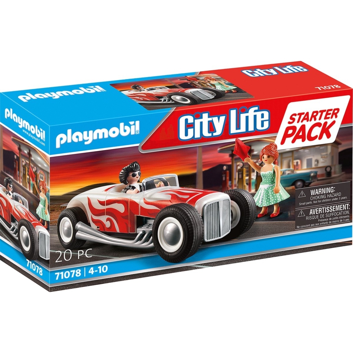 Stap in en ga erop los met de coole Starter Pack Hot-Rod van PLAYMOBIL! De bestuurder zwaait nonchalant achter het stuur van zijn hot-rod, versierd met een indrukwekkend vlammenpatroon. Verwacht zijn nieuwe vriendin hem al?