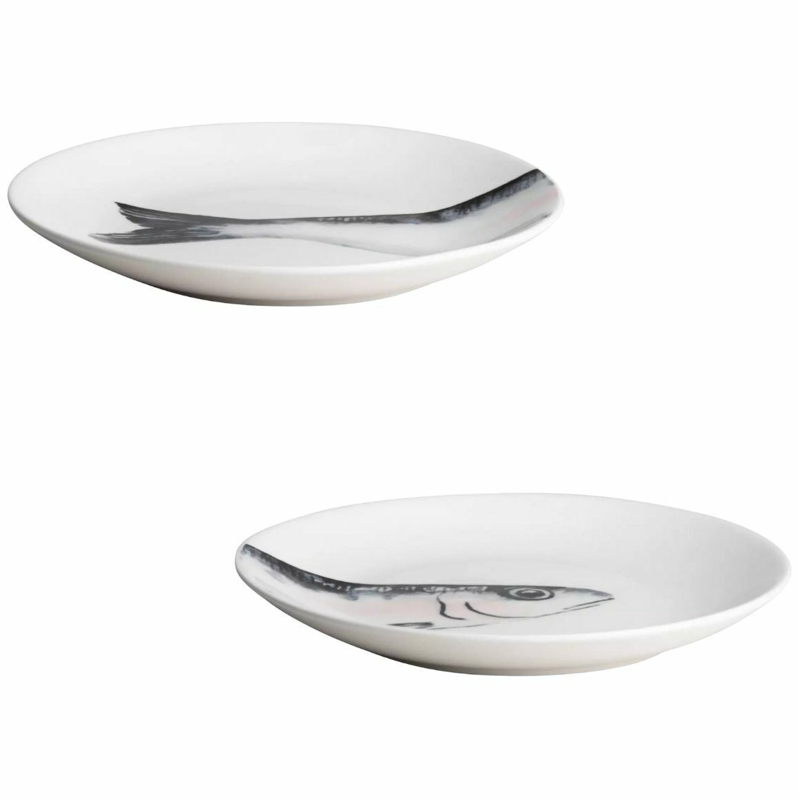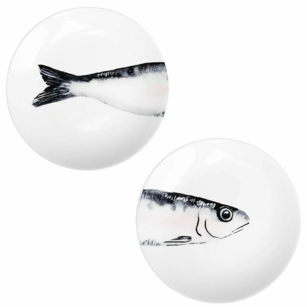 Op het ene bord staat de helft van een sardientje en op het andere bord de andere helft. Deze grappige borden brengen een speelse twist en zijn overal voor te gebruiken.