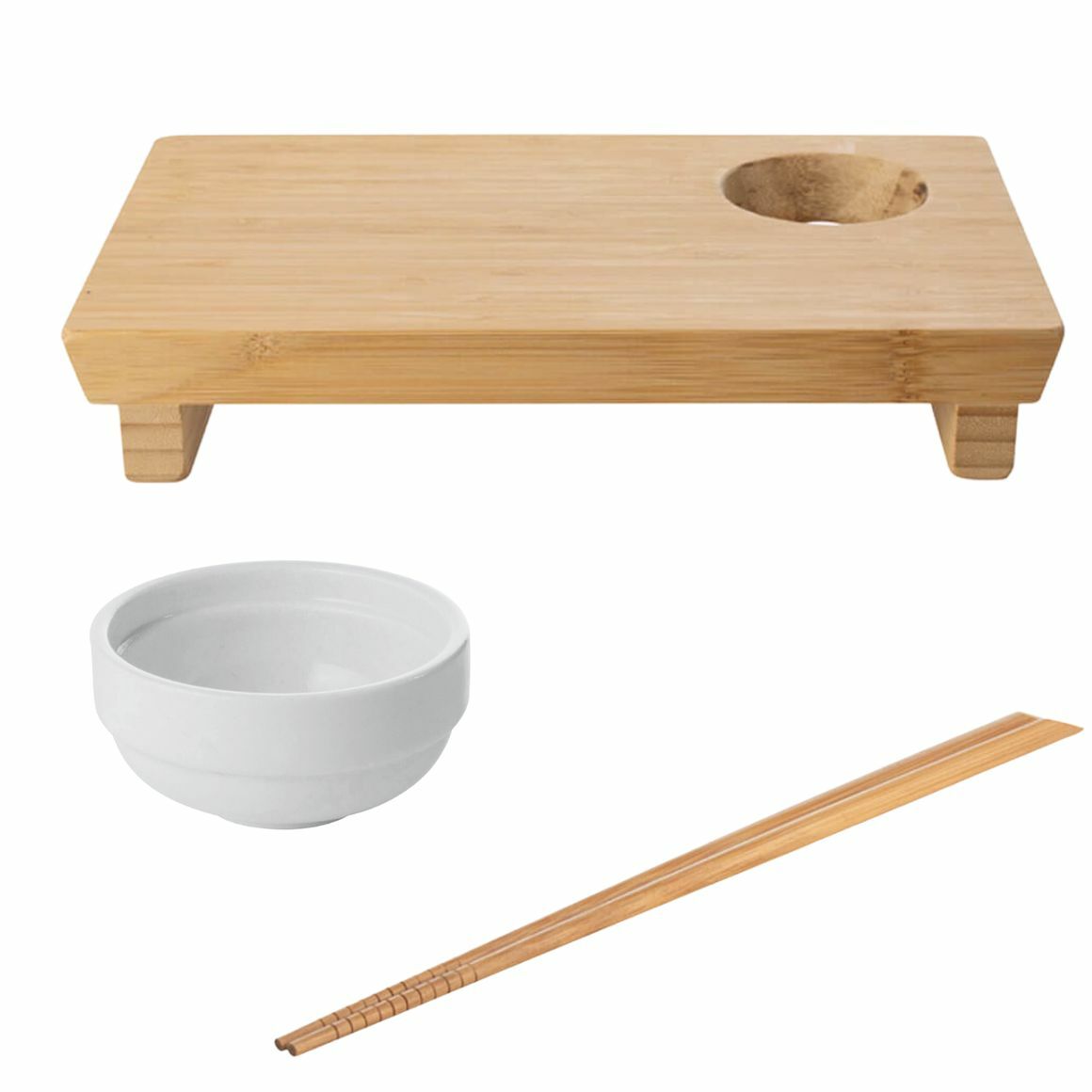 Sushi eten wordt nog leuker met deze stijlvolle Sushi set! De set bestaat uit een bamboe tray op pootjes, een keramisch schaaltje voor je sojasaus of wasabi en uiteraard een set eetstokjes. Dek je tafel met deze set en geniet van je maki, nigiri, sashimi en nog meer Japanse heerlijkheden.