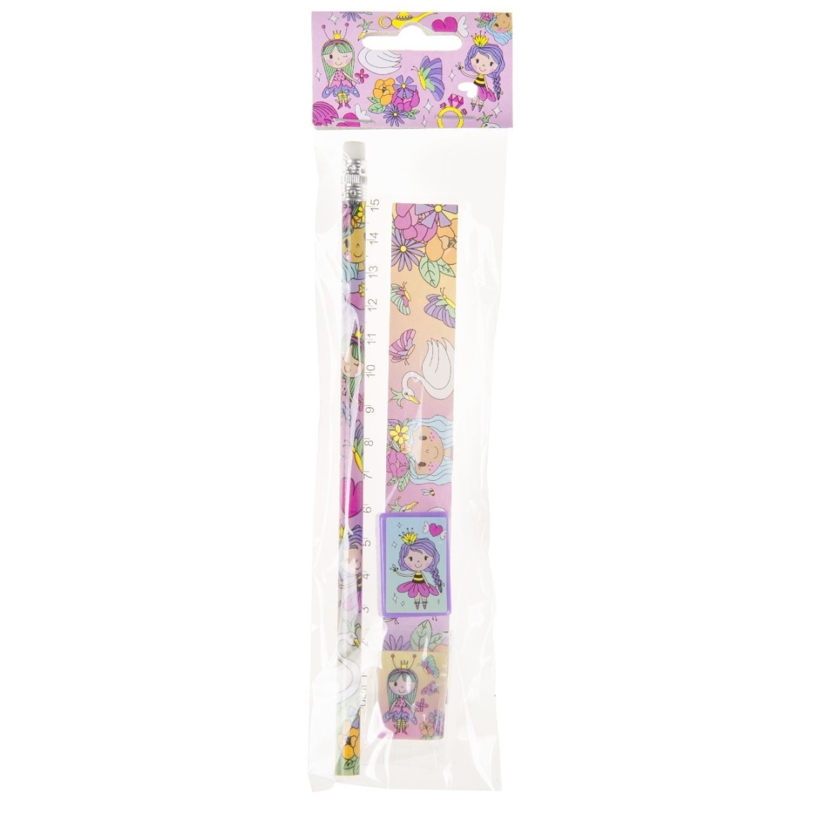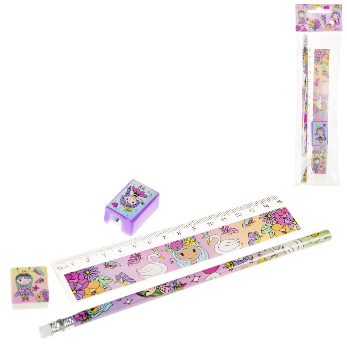De set bevat een potlood, liniaal, gum en puntenslijper.