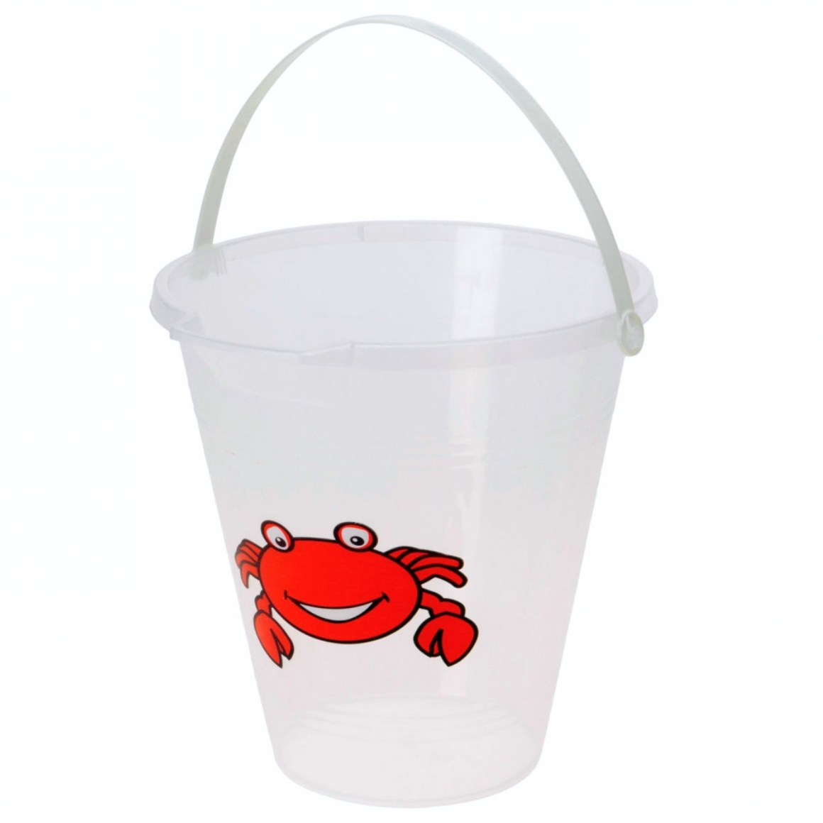 Transparante emmer met de opdruk van een krab. De emmer is gemaakt van polypropyleen en beschikt over een schenktuit.
