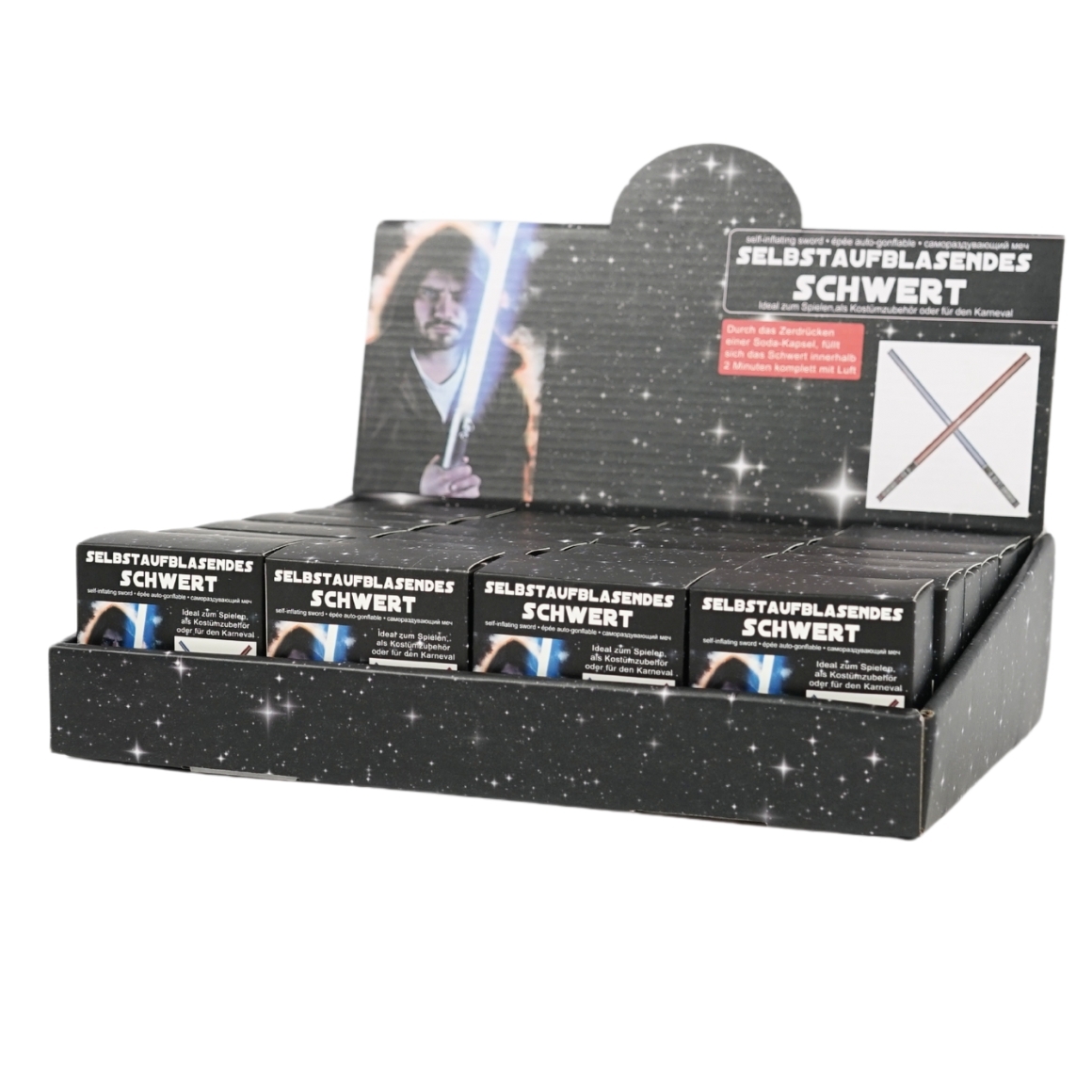 Wordt geleverd in een display van 24 stuks, in één doosje zit één opblaasbaar zwaard.