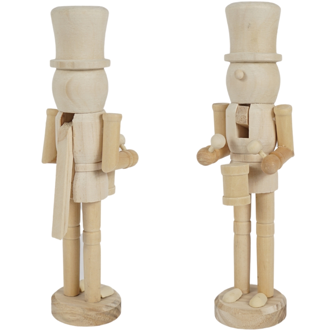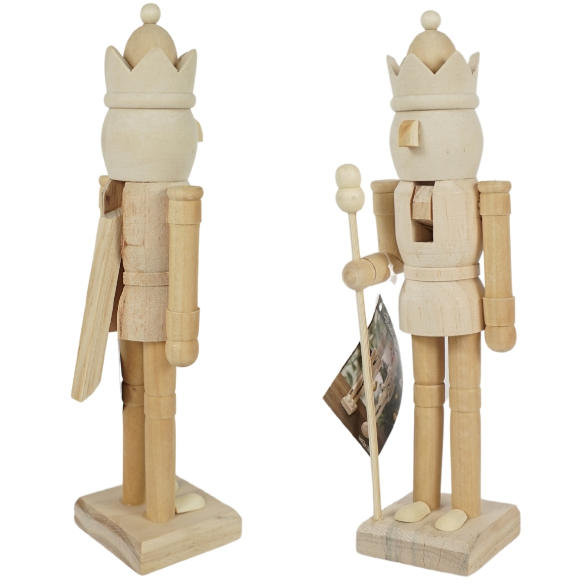 Deze houten notenkraker is perfect voor DIY-projecten en kan zelf geschilderd worden. Gemaakt van FSC-gecertificeerd hout, verkrijgbaar in twee varianten: één met kroon en staf, en de andere met hoge hoed en trommel. Een decoratieve toevoeging voor de feestdagen en leuk om zelf te personaliseren.