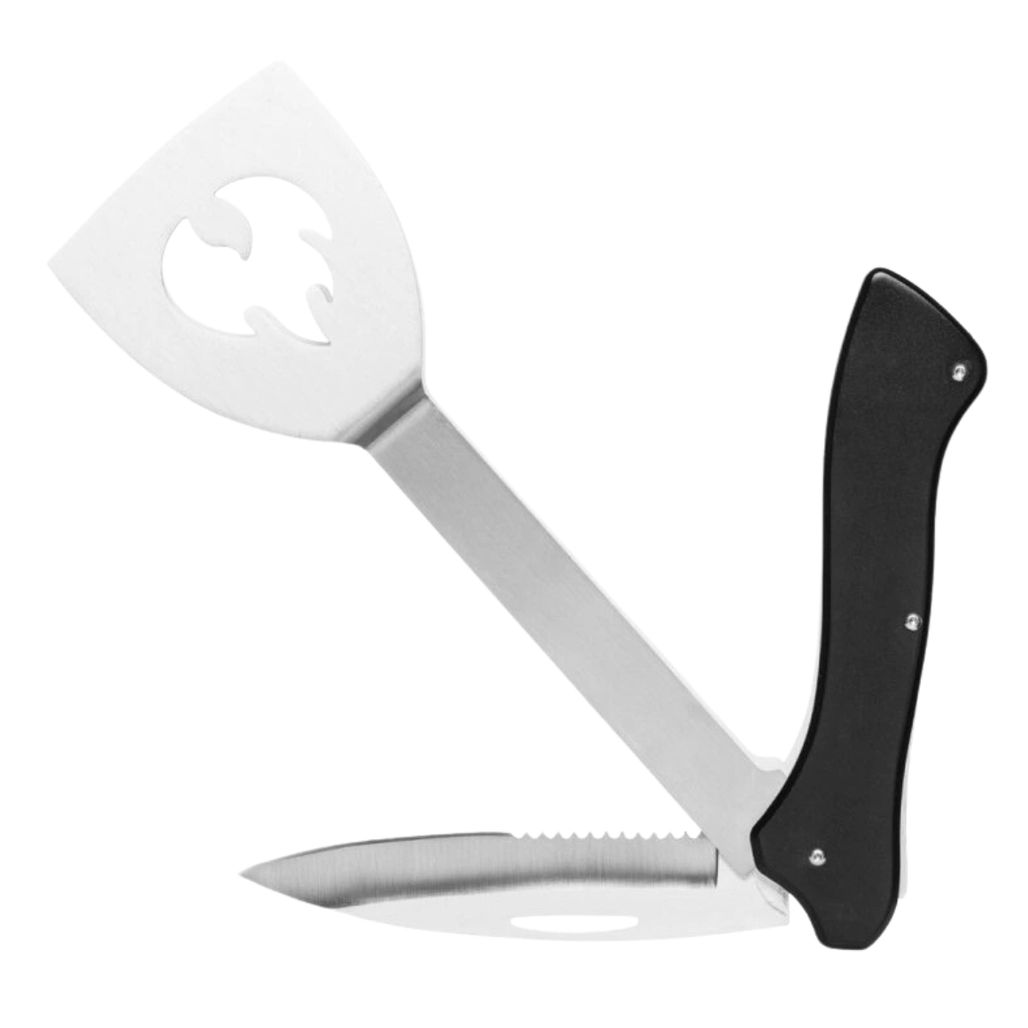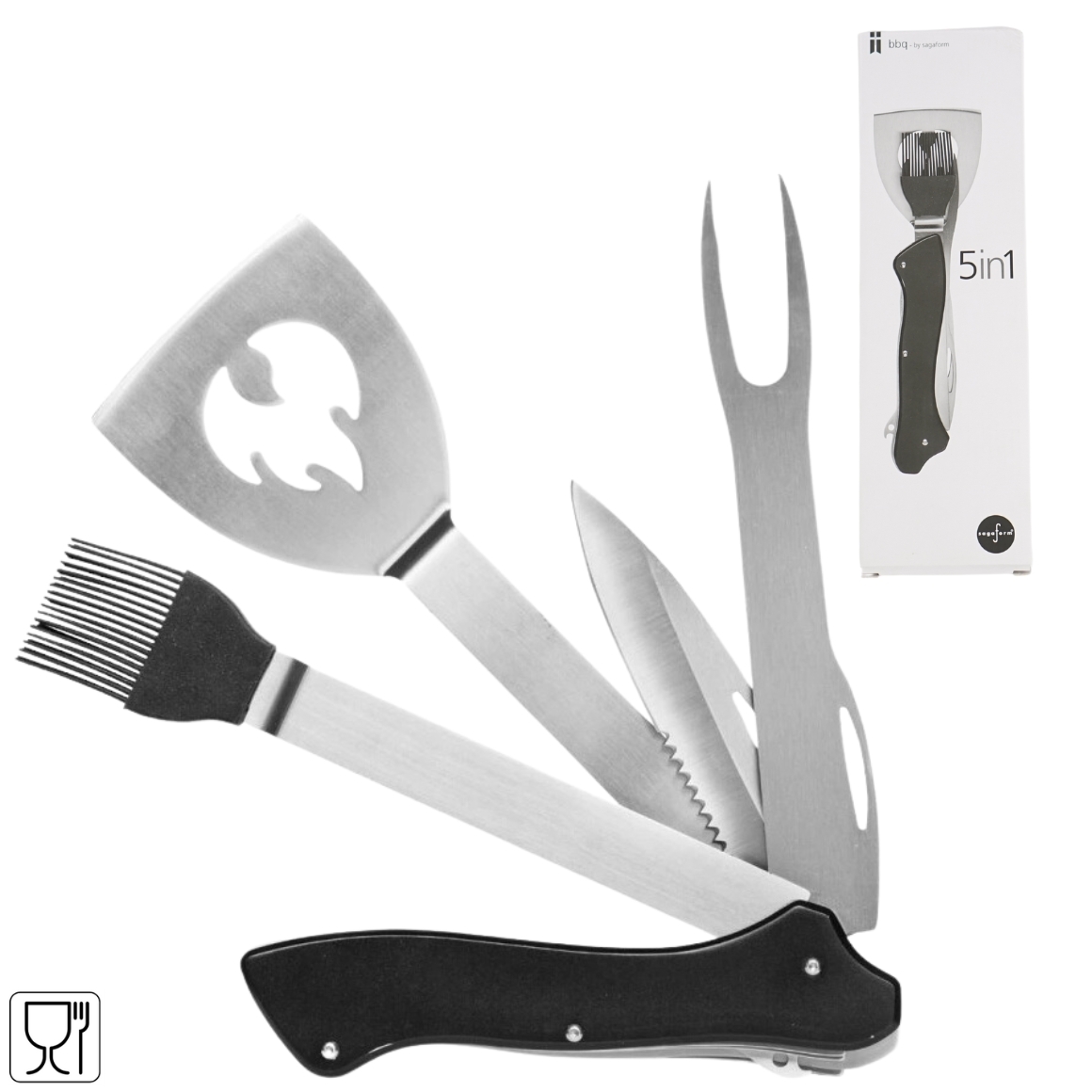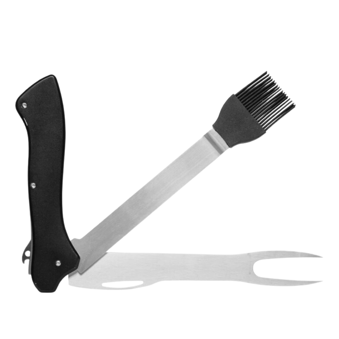 De tool bevat een mes, een vleesvork, een spatel, een siliconen borstel en een flesopener.