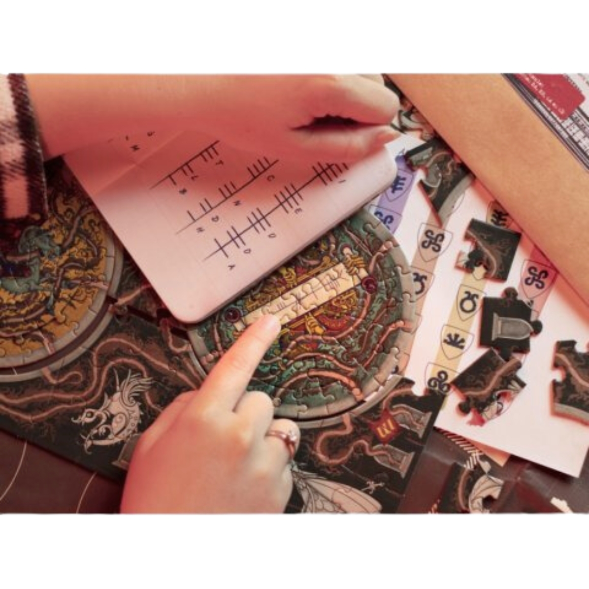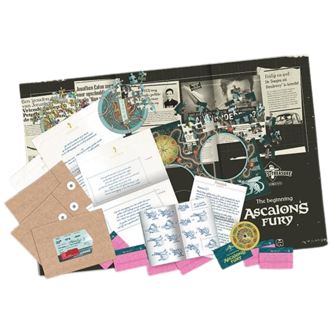 3 enveloppen met daarin legpuzzels, brieven, amulet, hintkaarten en hintlezer.