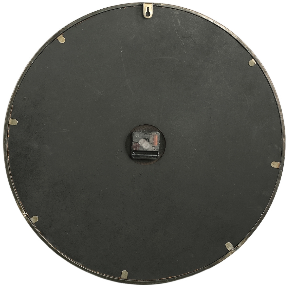 De klok heeft een messingkleurige metalen rand en een achtergrond van rattan.