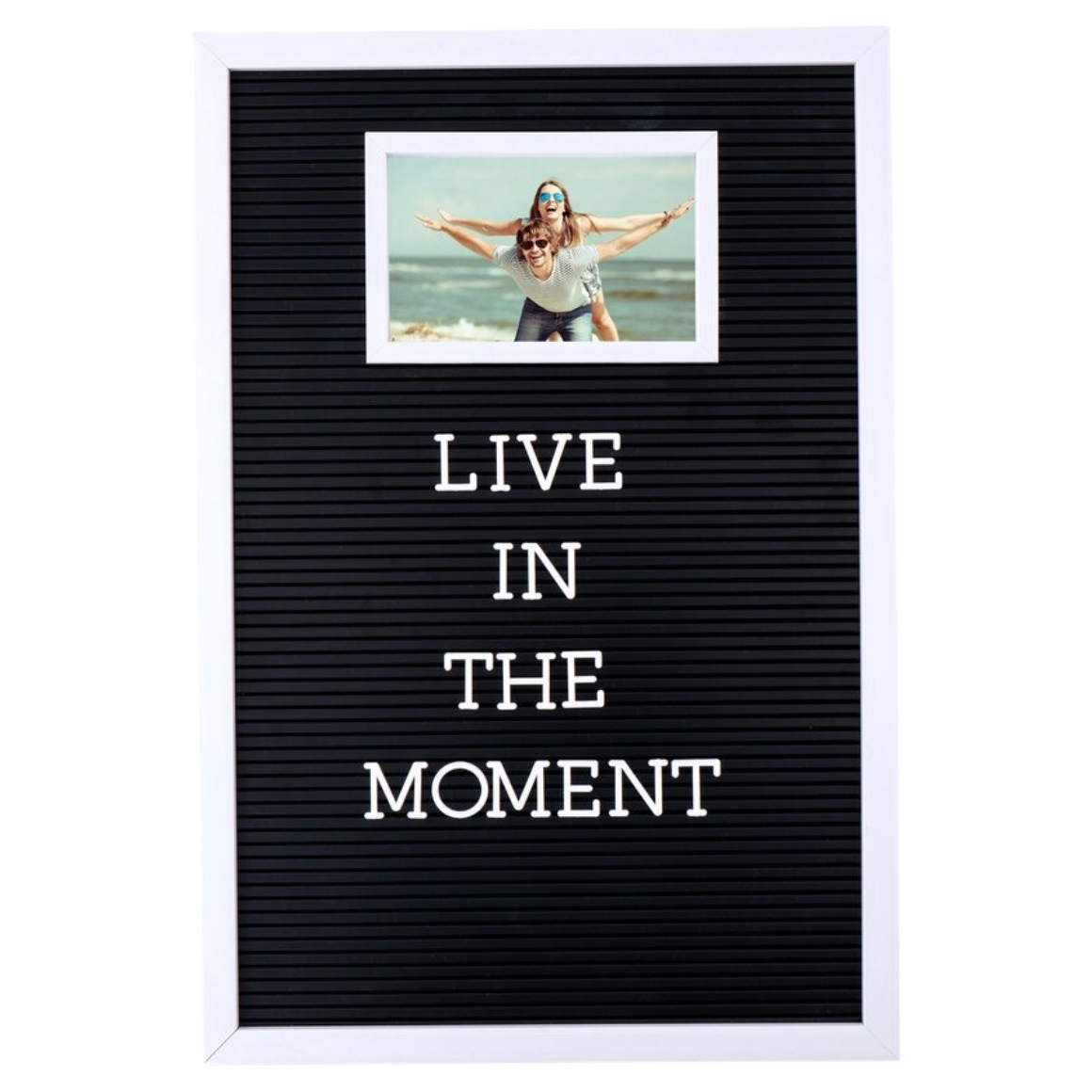 Stijlvol zwart letterbord met witte letters, voorzien van een witte lijst. Met een afmeting van 45 x 30,5 cm beschikt het bord over een geïntegreerde fotolijst, geschikt voor foto's van 10 x 15 cm.
