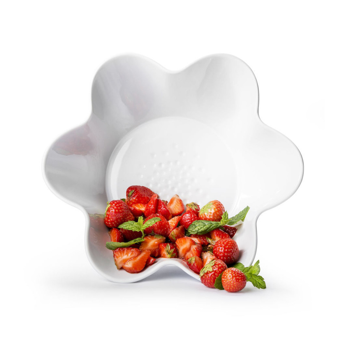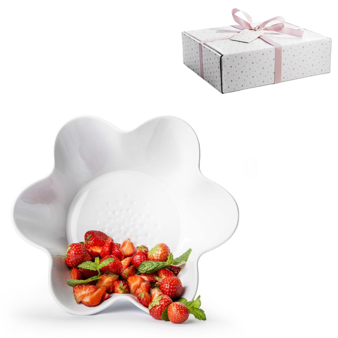 Deze witte bloemvormige schaal uit de Piccadilly-serie van Sagaform is perfect voor zowel bakken als serveren. Gemaakt van keramiek, heeft de schaal een diameter van 25,5 cm en een hoogte van 8 cm. Hij is geschikt voor gebruik in de oven en kan na gebruik eenvoudig in de vaatwasser worden gereinigd. De schaal wordt geleverd in cadeauverpakking, compleet met een kaartje en lintje.