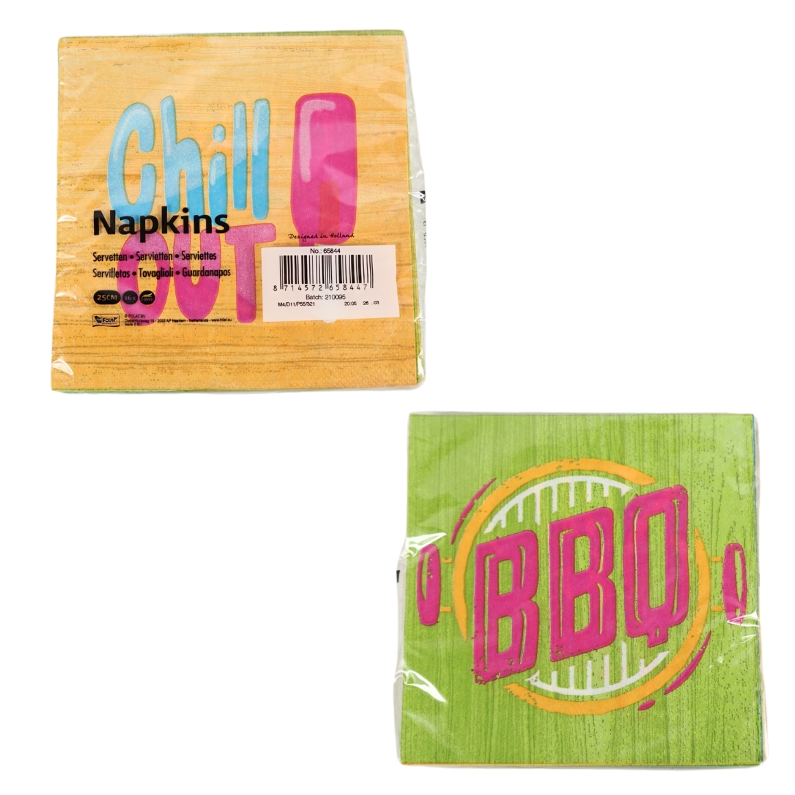 Deze set van 16 papieren servetten is perfect voor een ontspannen barbecue of een gezellige borrel. De servetten zijn dubbelzijdig bedrukt: de ene kant met de tekst Chill Out en de andere kant met de tekst BBQ. Ze zorgen voor een leuke en sfeervolle tafelsetting. De servetten zijn 2-laags en hebben een afmeting van 25 cm, ideaal voor elke gelegenheid.
