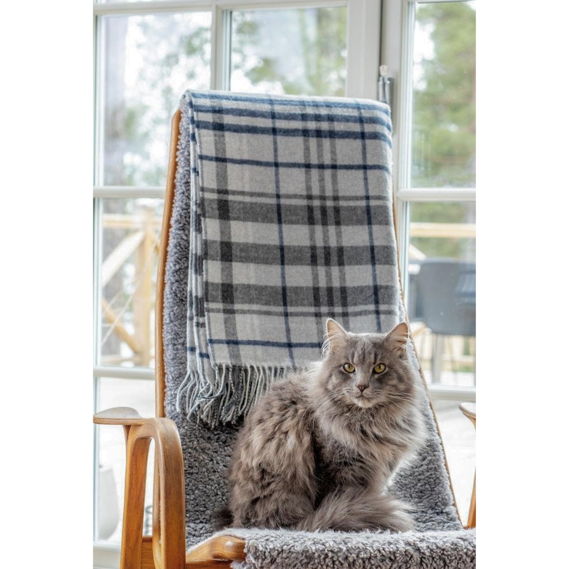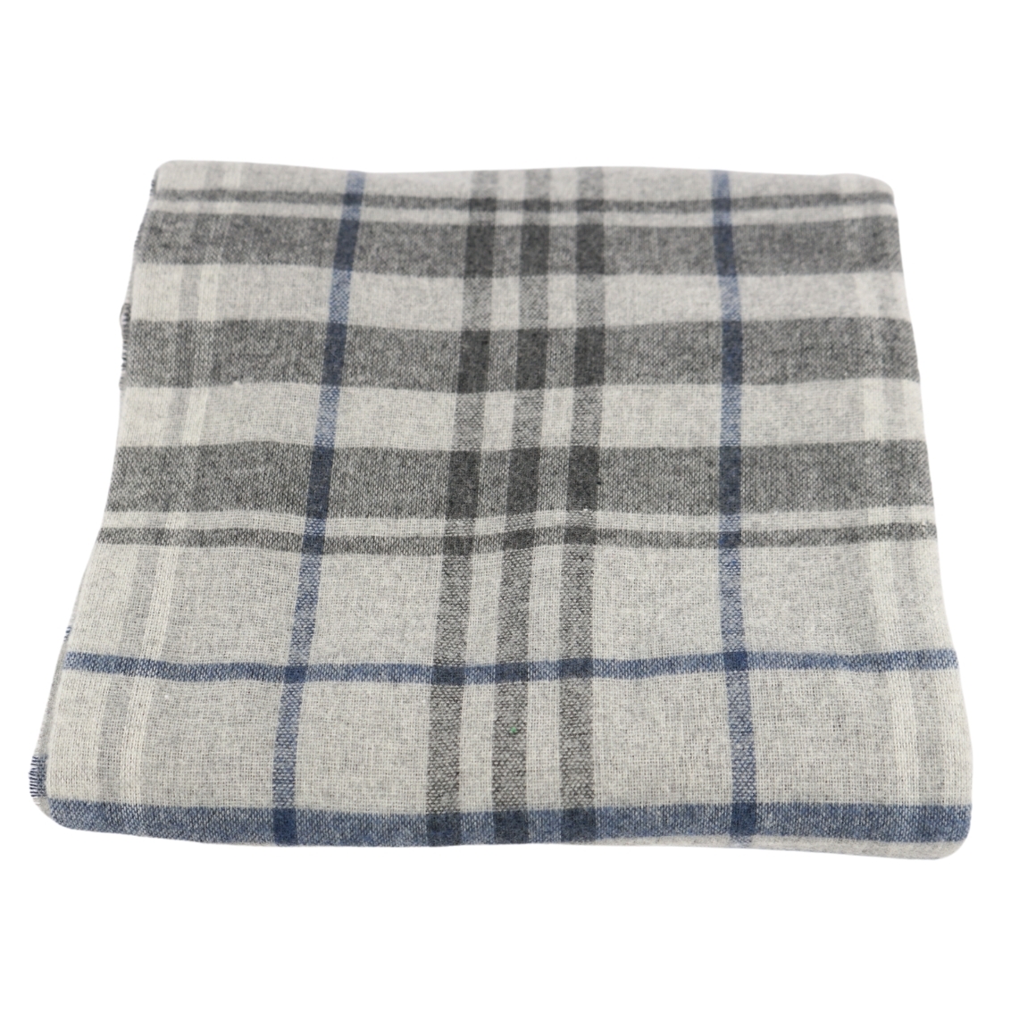De plaid is grijs en heeft een gestreept patroon met blauwe en grijze streepjes. Het is afgewerkt met franjes en biedt zowel warmte als een moderne uitstraling. De afmeting is 130 x 170 cm.