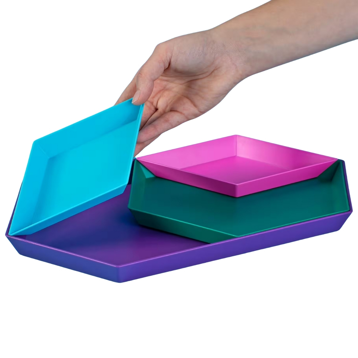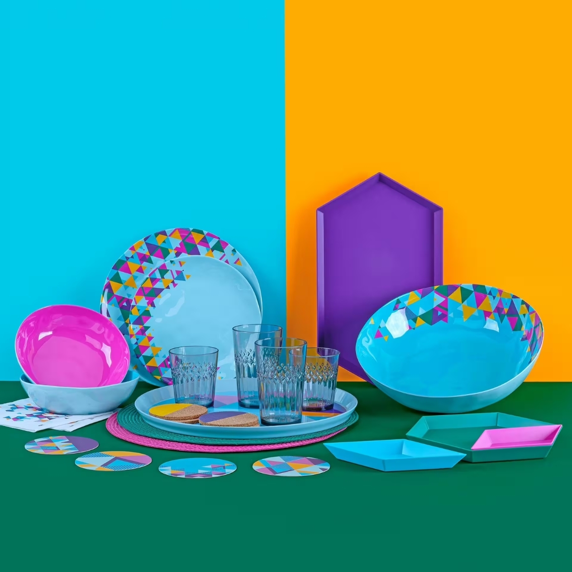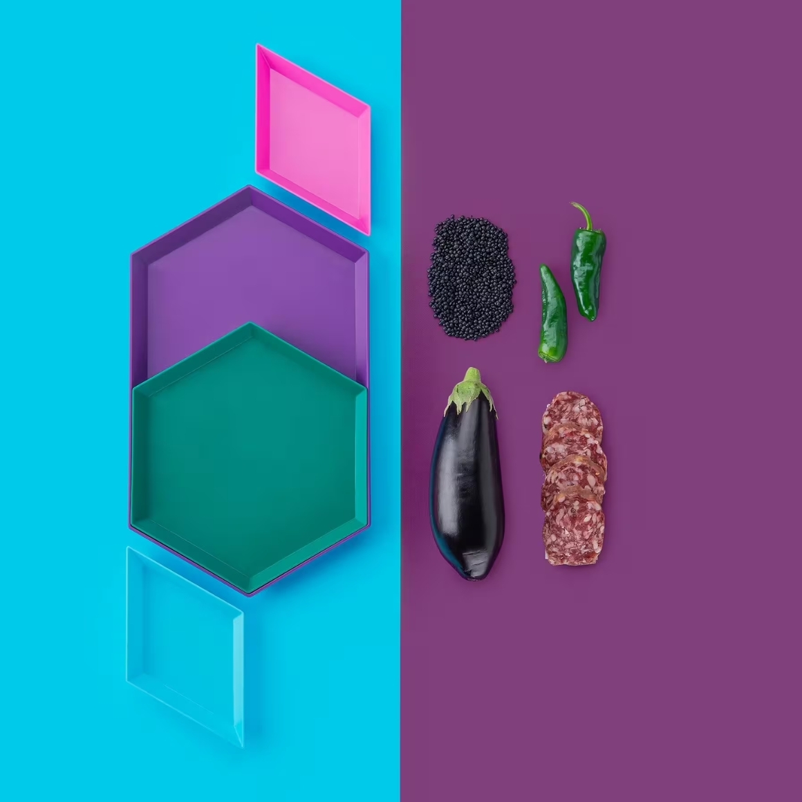 Het lijkt wel Tetris! De vier serveerschalen kunnen steeds opnieuw in elkaar worden gestapeld en vormen zo een grote, moderne snackschaal voor vier, vijf of meer verschillende soorten antipasti, tapas, pinda's, chips, fruit en alles wat u maar lekker vindt. De geometrische figuren in roze, paars, groen en blauw zien er supercool uit en zijn ook nog eens praktisch. De kunststof schalen zijn zeer licht en kunnen eenvoudig in de vaatwasser worden gereinigd. Het artikel is foodsafe.