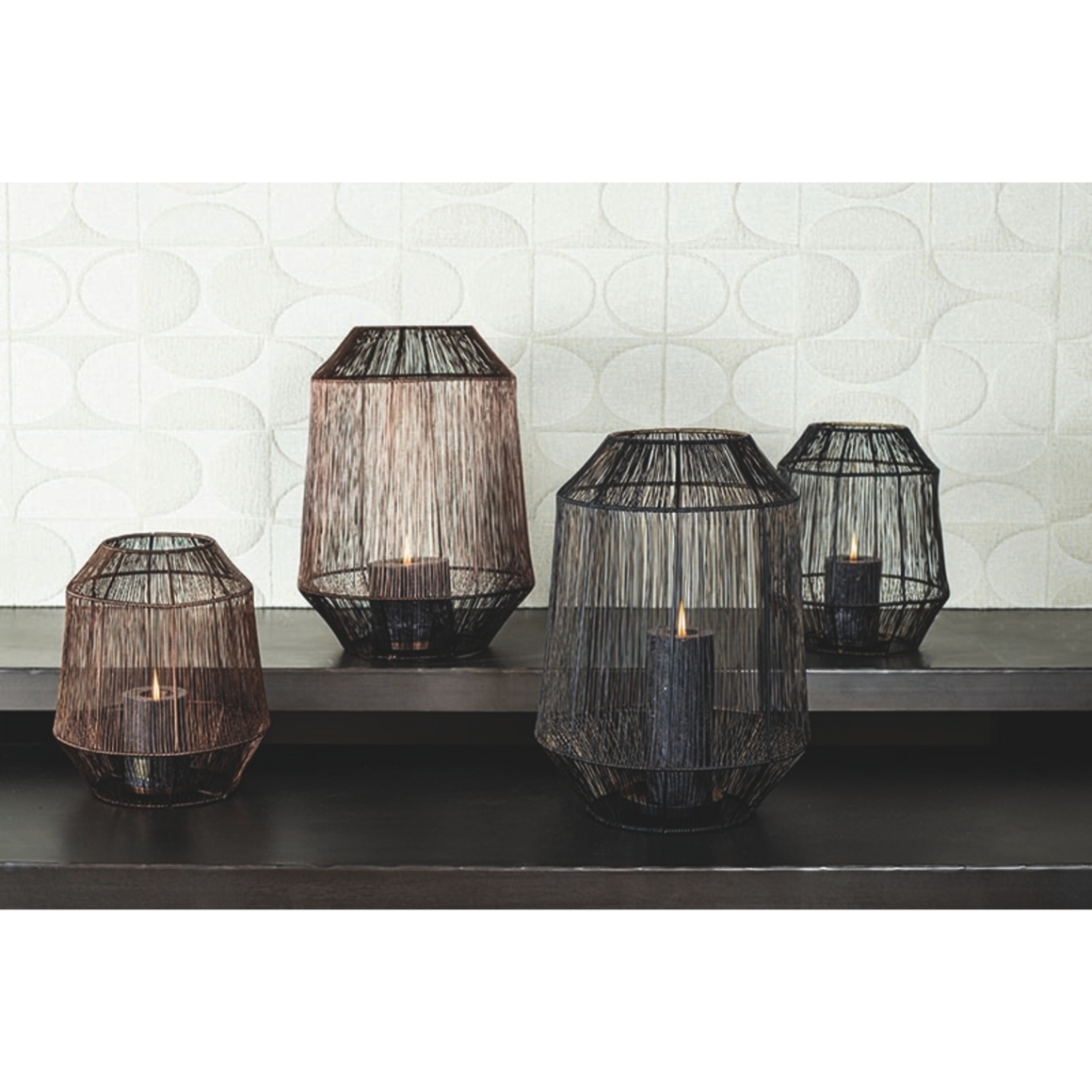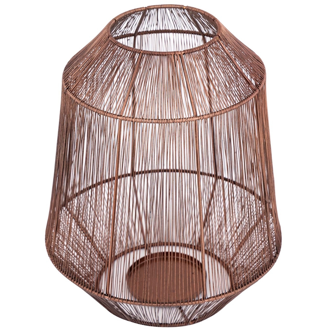 Windlicht van het merk PTMD uit de serie Justy. Het windlicht is gemaakt van een metalen frame met daarom heen ijzerdraden gespannen.