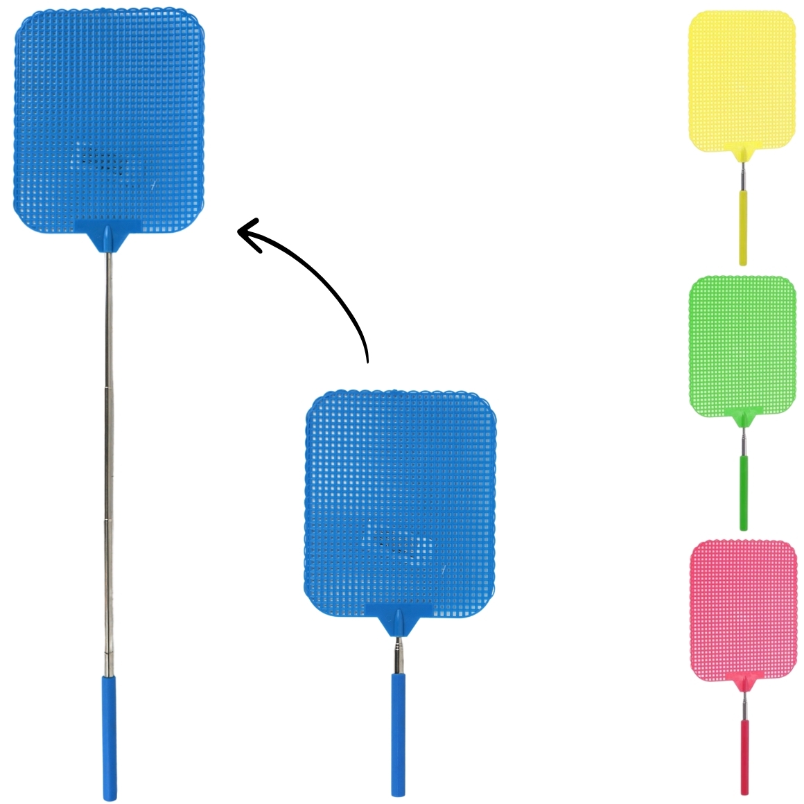 Artikel wordt assorti geleverd, de prijs is per stuk. Handige vliegenmepper van kunststof, uitschuifbaar van 34 cm naar 66 cm. Dankzij het verlengbare handvat zijn ook moeilijk bereikbare plekken eenvoudig te bereiken. Onmisbaar voor gebruik in huis, op kantoor of buiten tijdens de zomermaanden.