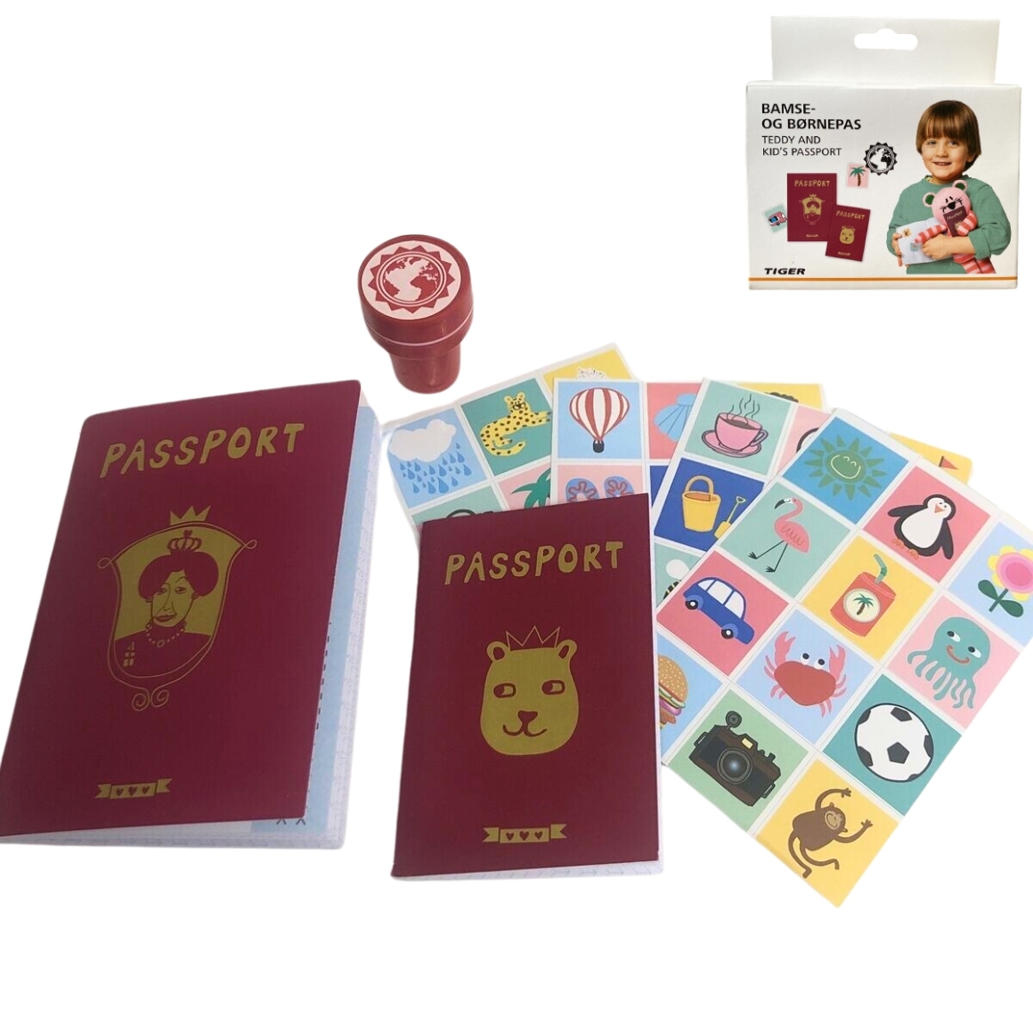 Douane speelgoedset bestaande uit 2 paspoorten, 4 stickervellen en een stempel.