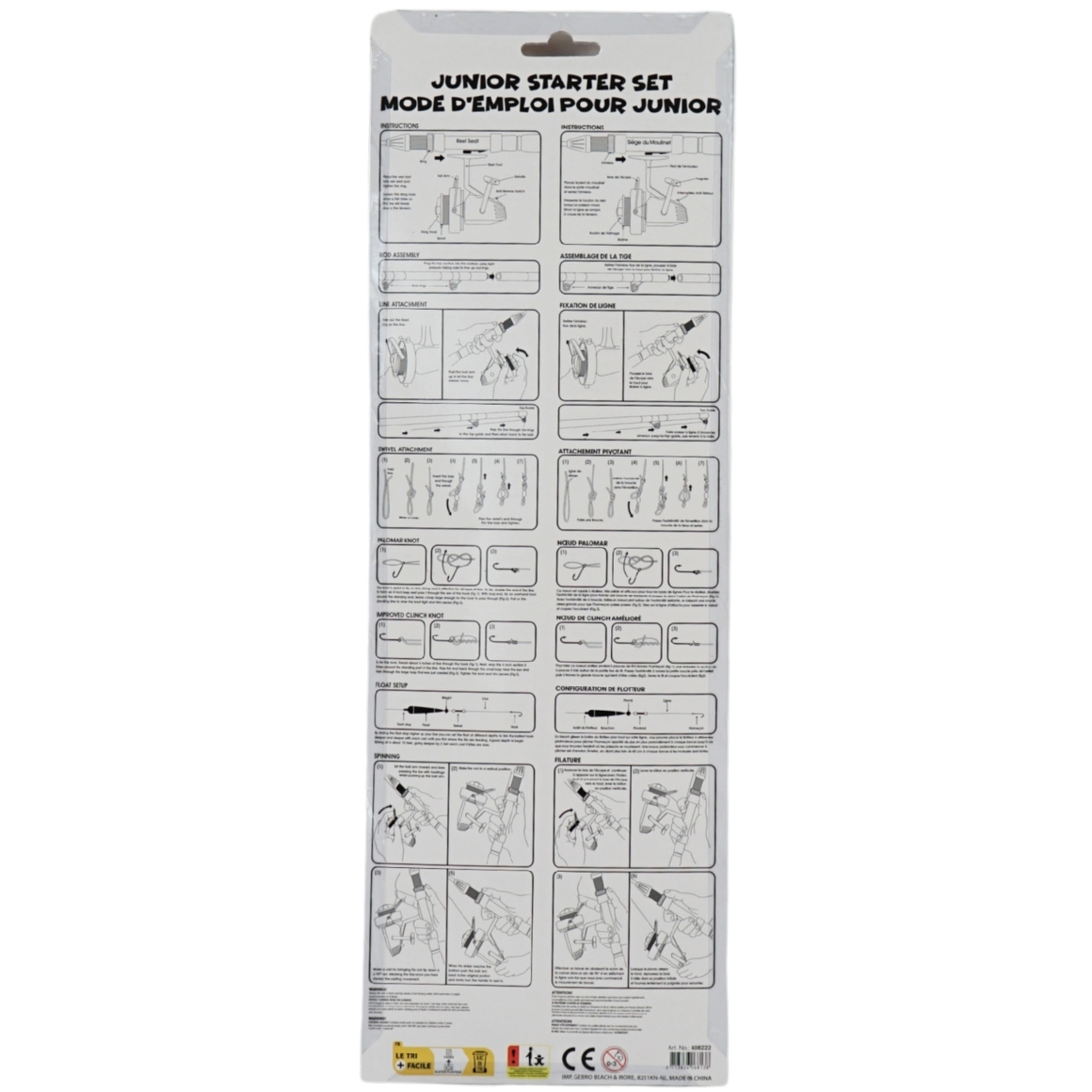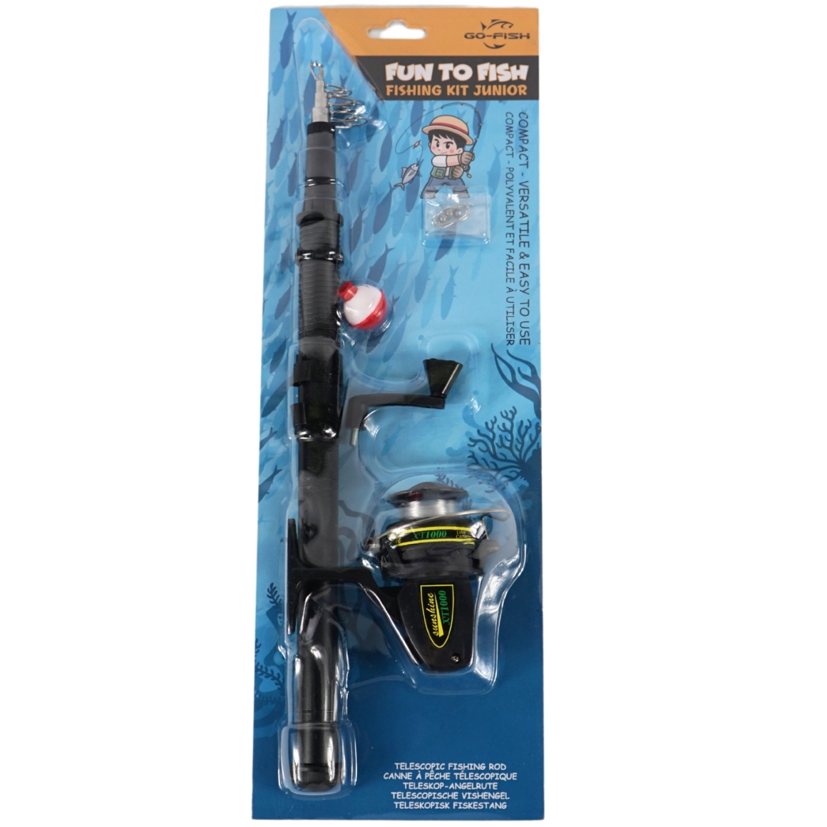 De set bevat drie haakjes, drie loodjes en een dobber, zodat je direct kunt beginnen. Het lichte, stevige materiaal biedt een comfortabele grip en langdurige prestaties. Geschikt voor beginnende jonge vissers.