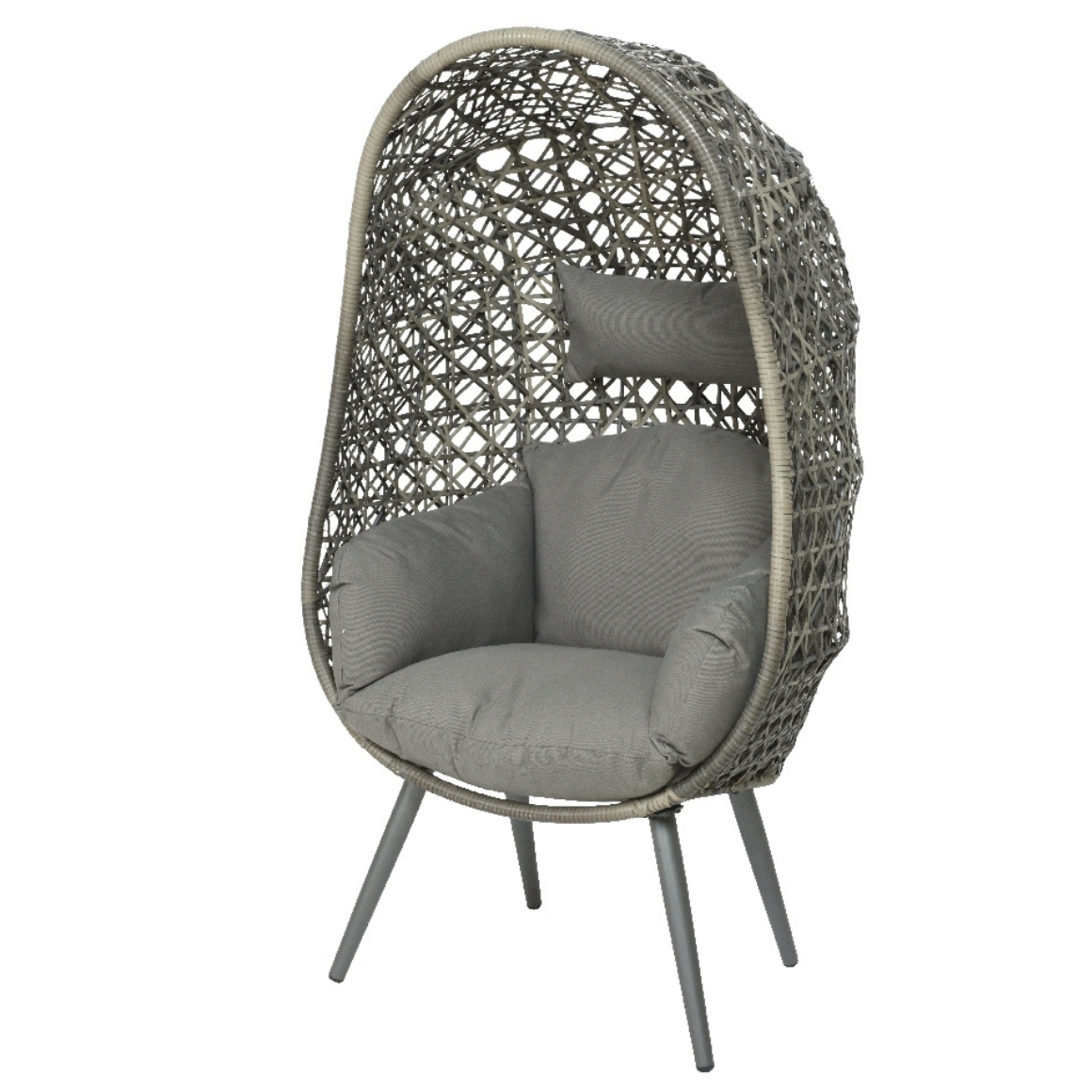 De Palermo eggchair combineert stijl en comfort in een speels ontwerp met een gemêleerd grijze koordstructuur. De stoel is 154 cm hoog en rust op een stevig, dubbel gepoedercoat stalen frame dat tot 120 kg draagkracht biedt. De meegeleverde kussens zijn uitgevoerd in grijs taupe en gemaakt van 220 g/m² polyester, waterafstotend en bestand tegen verkleuring door zonlicht. Een uitnodigende loungestoel voor ontspannen zitmomenten.