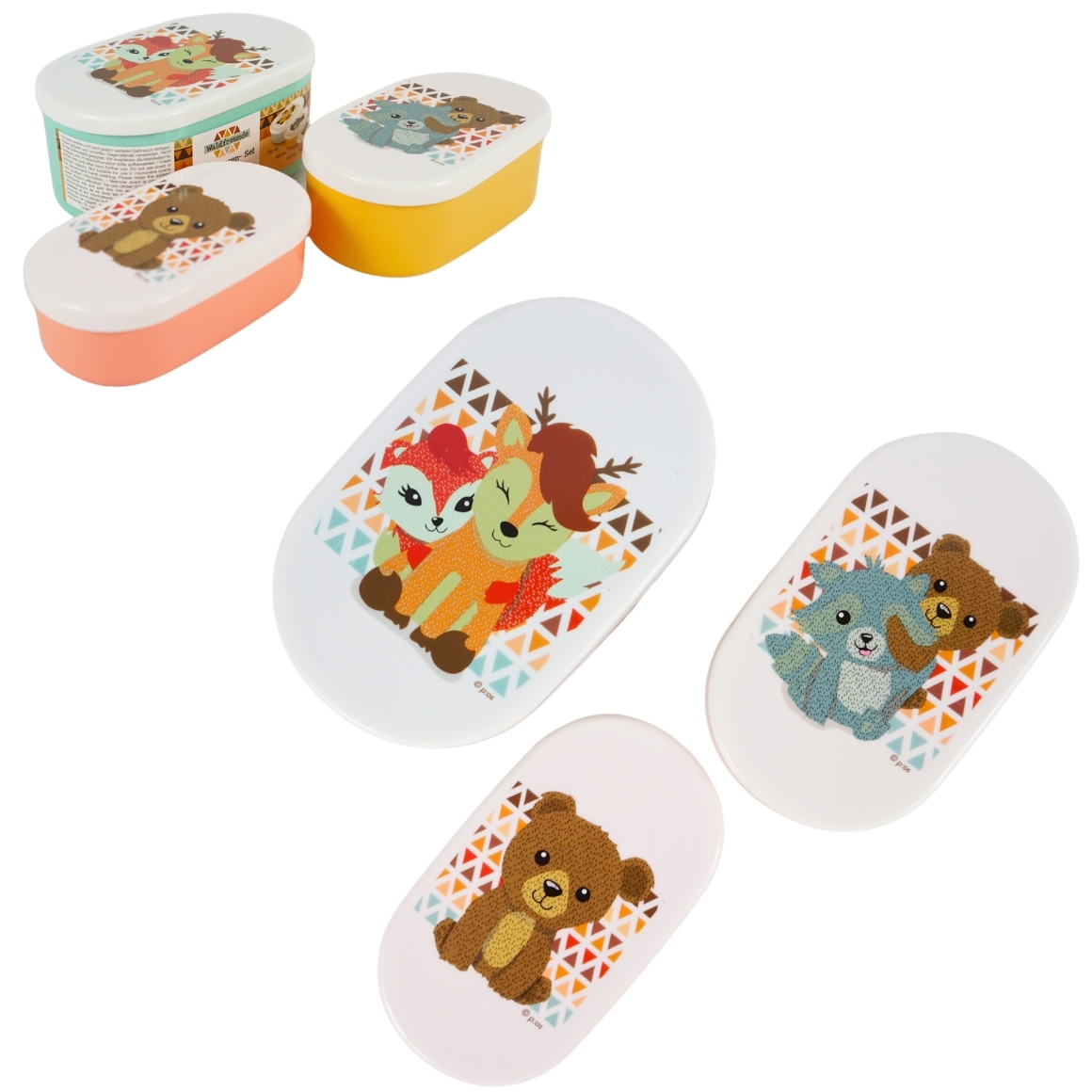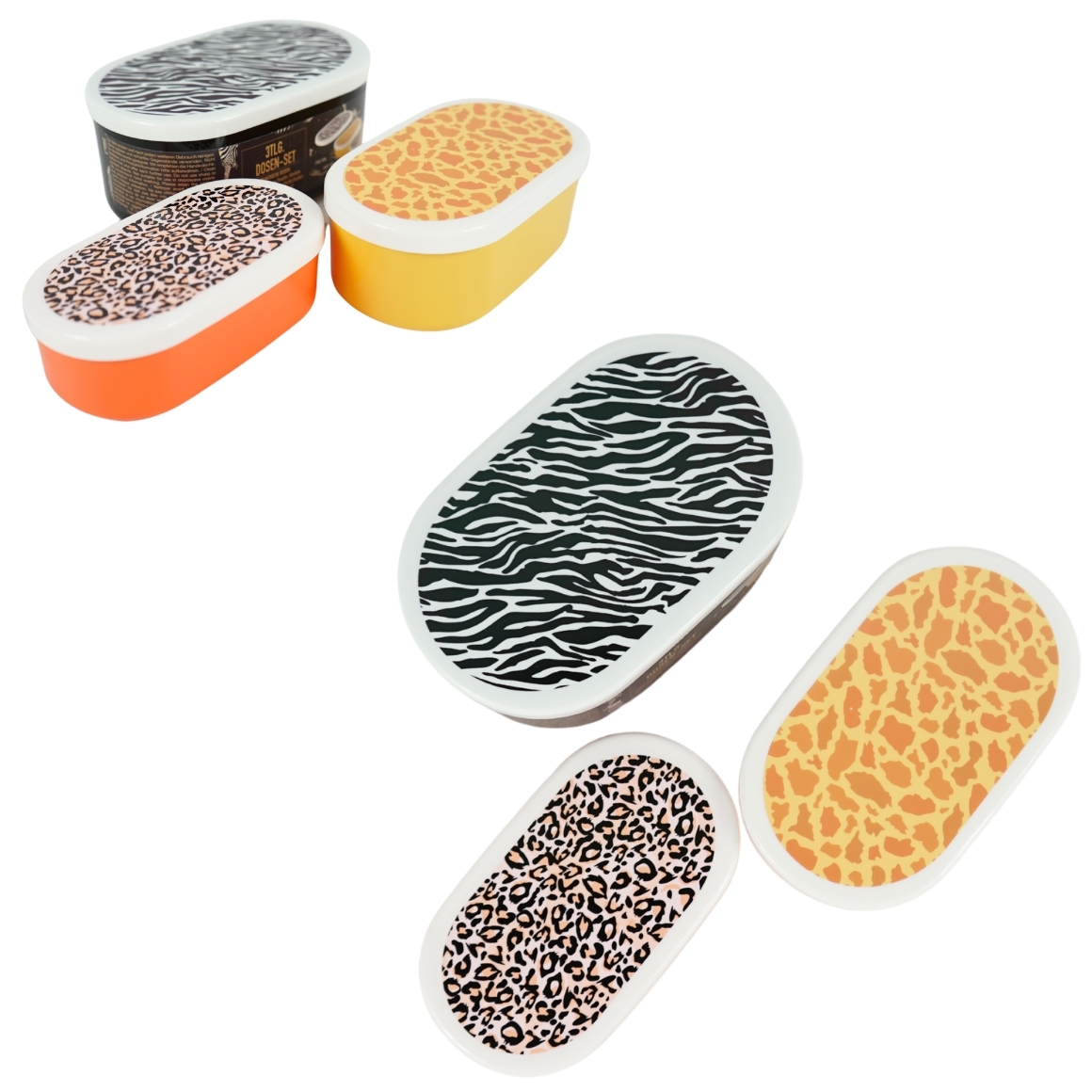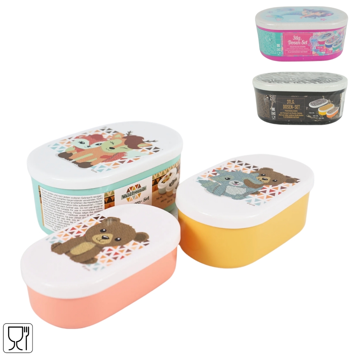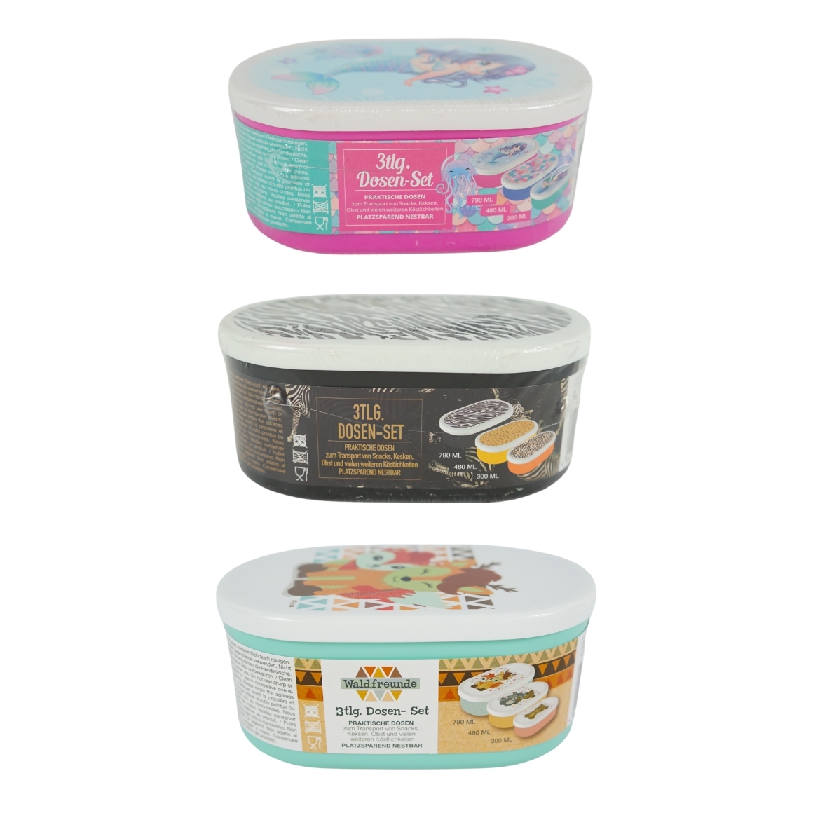 Set van 3 ovale lunchboxen in formaten van 790 ml, 480 ml en 300 ml. Voorzien van deksel en geschikt voor het meenemen van snacks, brood of fruit. Designs met bosdieren, zeemeermin en dierenprint. Gemaakt van foodsafe materiaal. Niet geschikt voor vaatwasser of magnetron. Prijs is per set van 3 stuks.