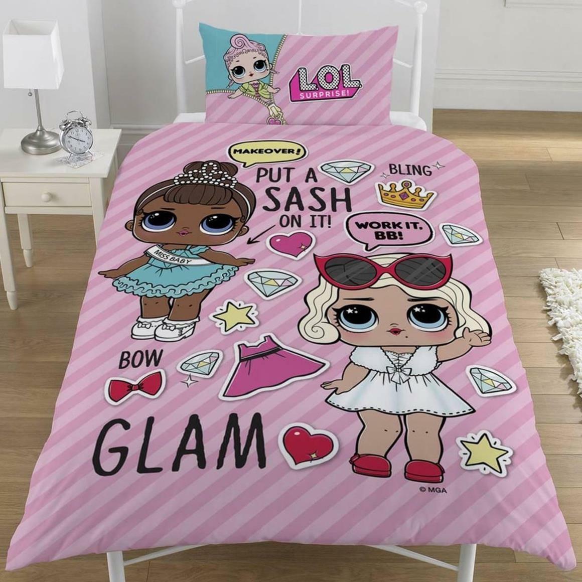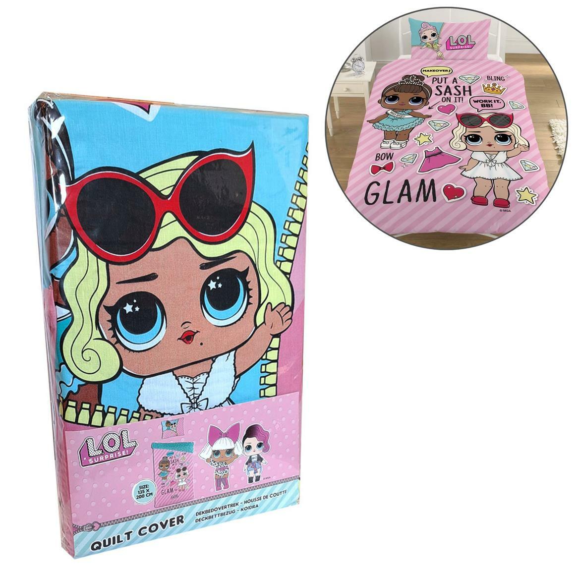 LOL Surprise dekbedovertrek in vrolijke kleuren roze en turquoise, met Glam print. Gemaakt van 50% katoen en 50% polyester. Inclusief kussenhoes van 80 x 80 cm. Geschikt voor kinderbedden, wasbaar tot 40°C.