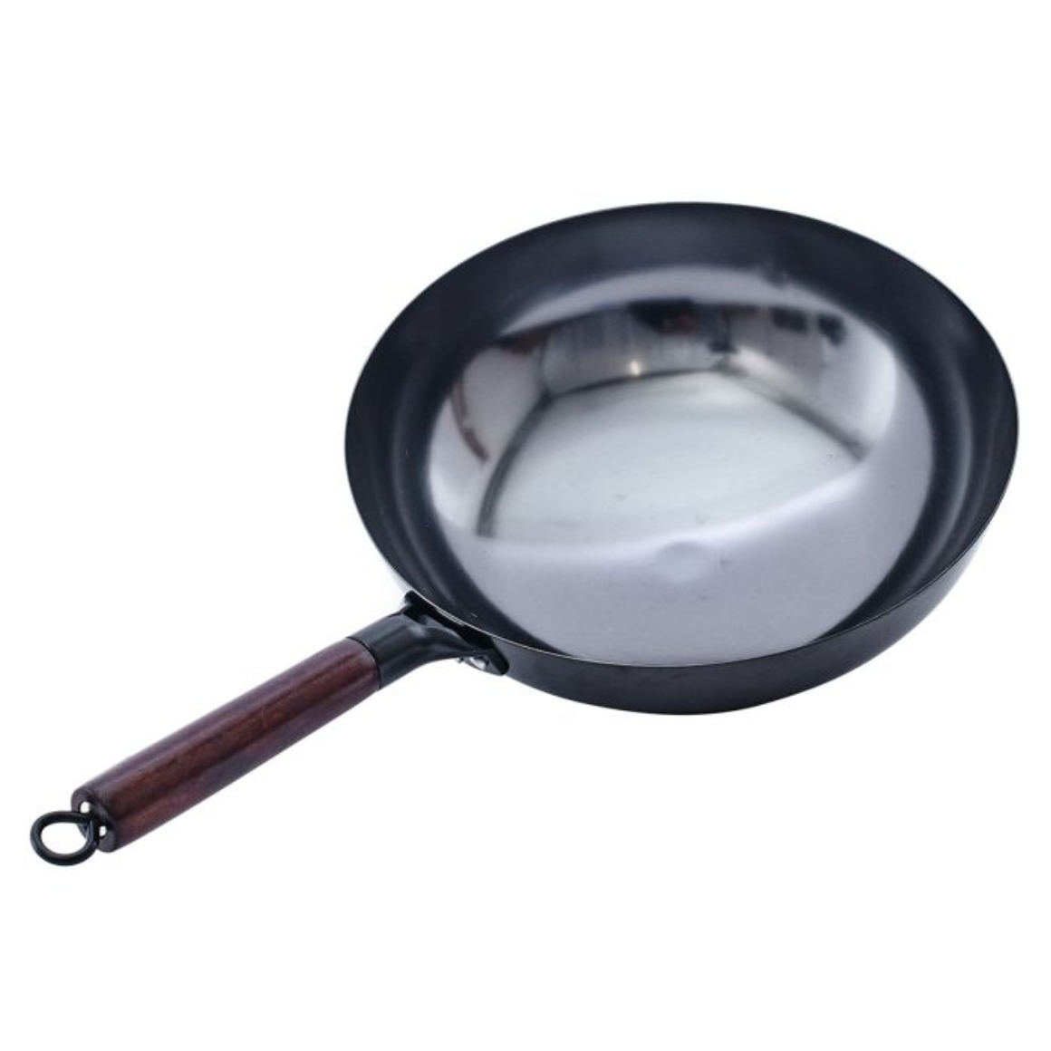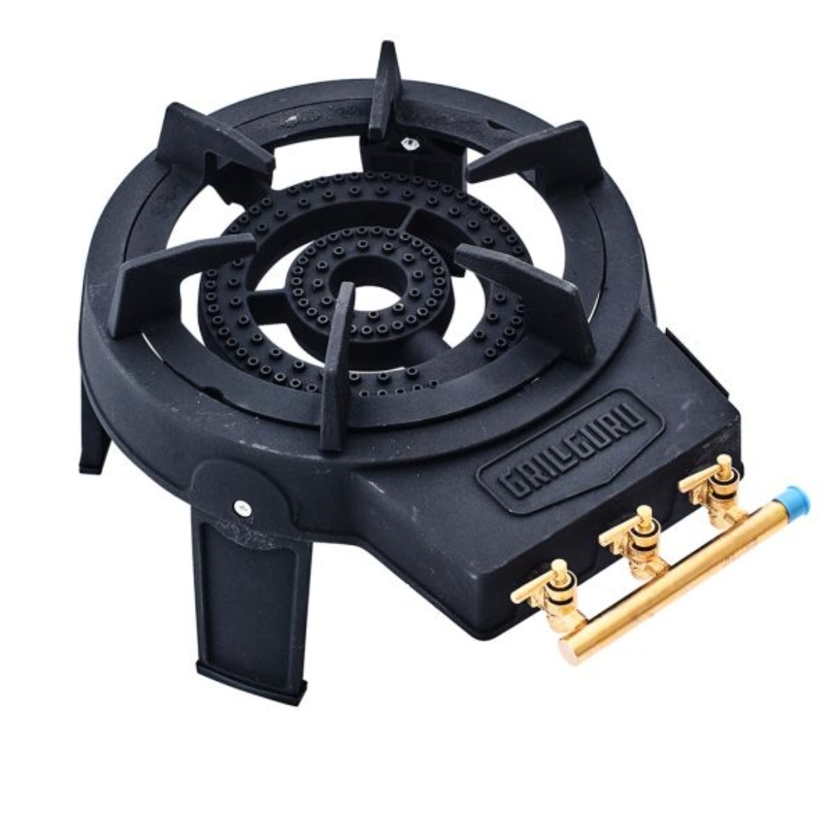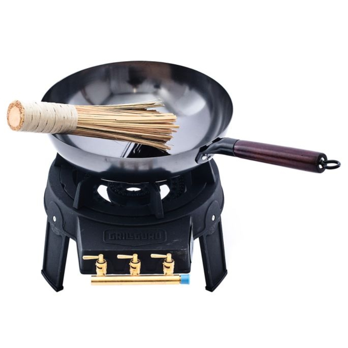 Complete set voor buitenkoken, bestaande uit een gietijzeren wokbrander, carbonstalen wokpan (Ø32 cm) en bamboe wokborstel. De brander (Ø26 cm, totale breedte 31 cm) heeft drie regelbare gaskranen en wordt geleverd inclusief slang en drukregelaar. Geschikt voor aansluiting op gasfles.
