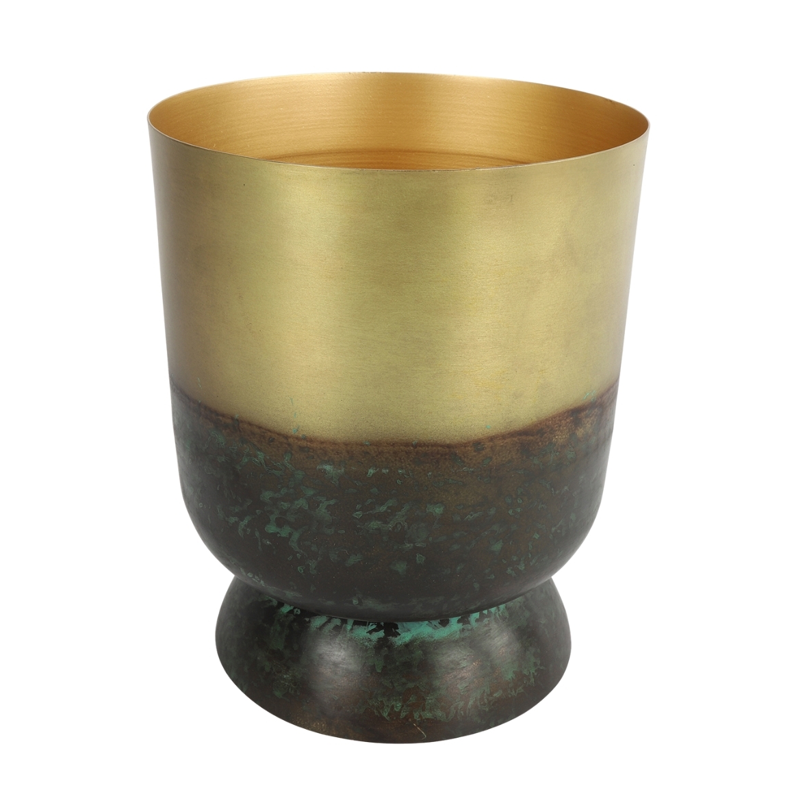 Decoratieve metalen bloempot op voet uit de Avelon-serie van Countryfield. De antiekgroene afwerking met messingkleurige details geeft dit model een klassieke uitstraling. Met een hoogte van 26 cm is dit een tijdloze eyecatcher voor elk interieur.