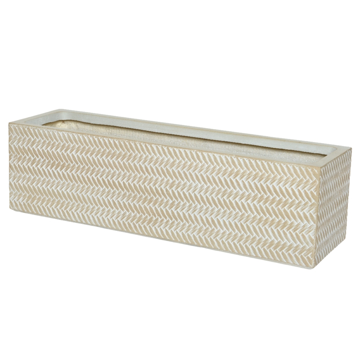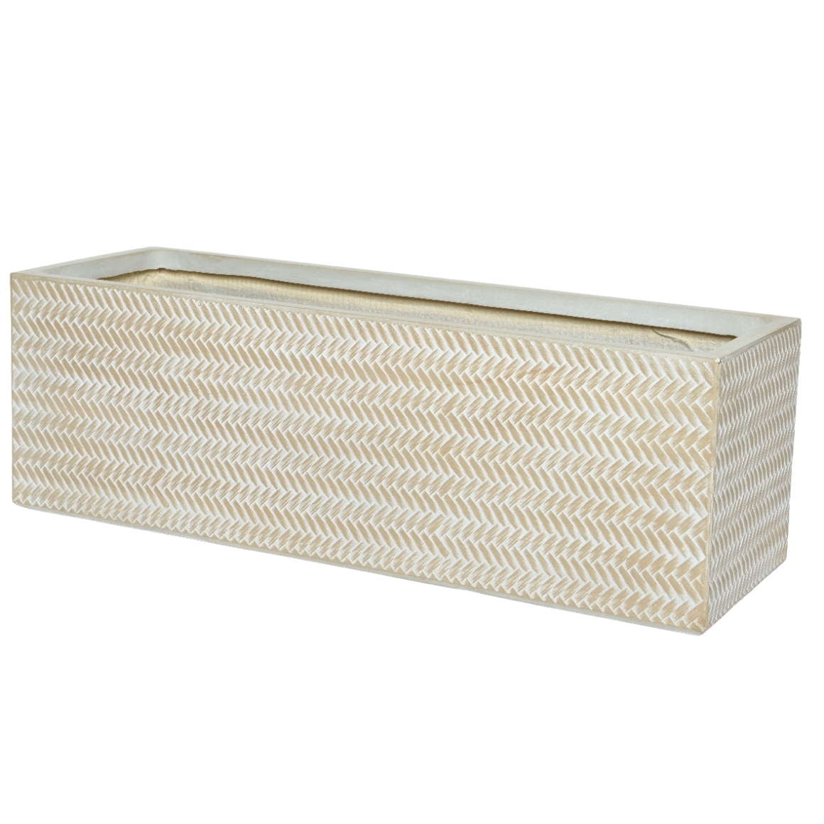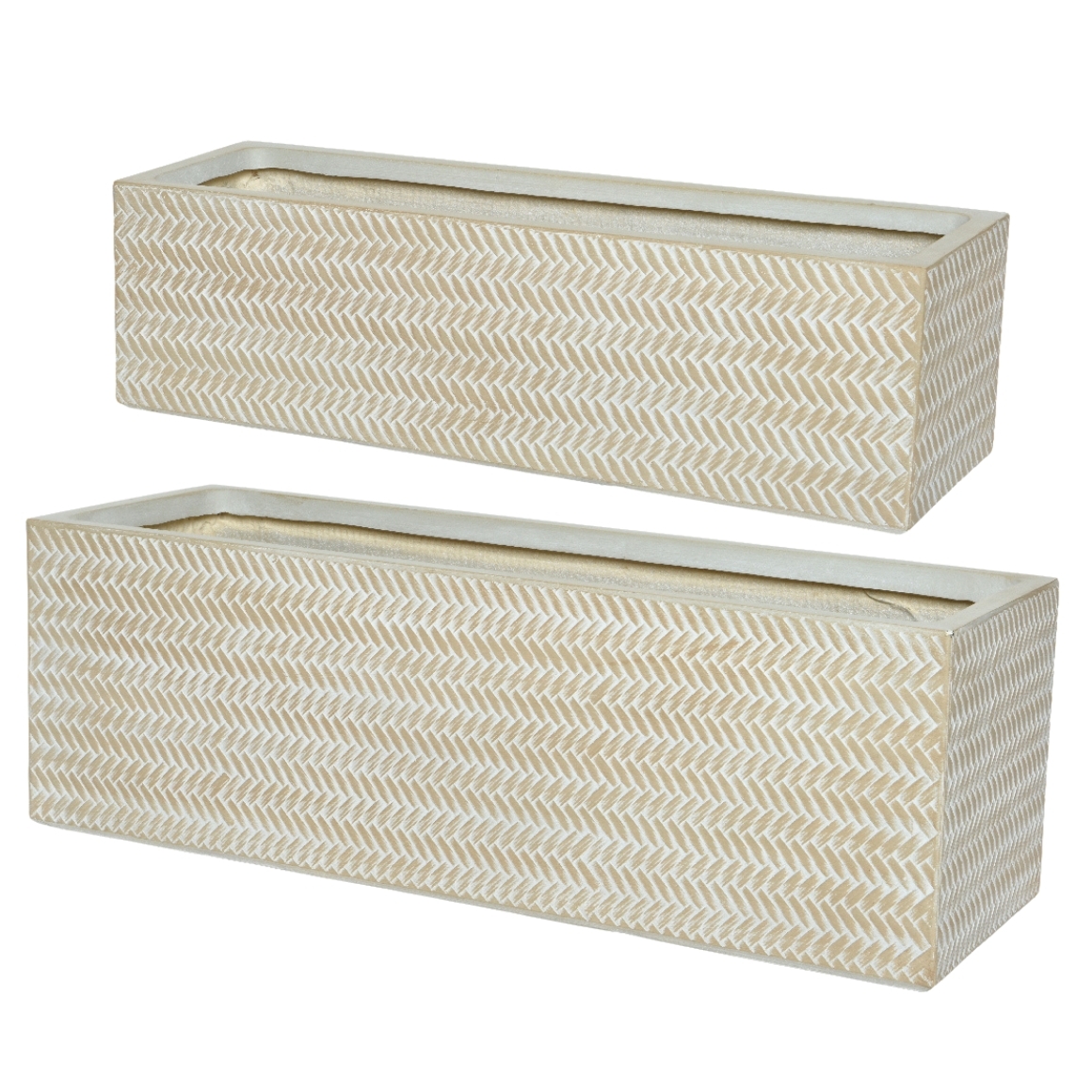 Deze set van twee rechthoekige bloembakken uit de Alex-serie is uitgevoerd in een neutrale zandkleur en geschikt voor zowel binnen- als buitengebruik. De bakken zijn gemaakt van stevig fibre clay en afgewerkt met een decoratief bamboepatroon. Dankzij het drainagegat en de meegeleverde plug kunnen de bakken eenvoudig worden aangepast aan de gewenste toepassing. De grote bloembak heeft een lengte van 70 cm, een breedte van 23 cm en een hoogte van 23 cm. De kleinere variant meet 60 cm lang, 17 cm breed en 17 cm hoog.